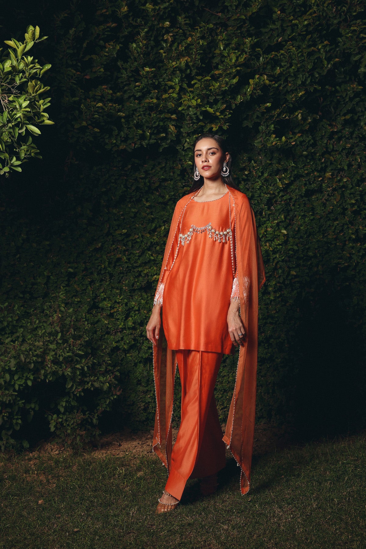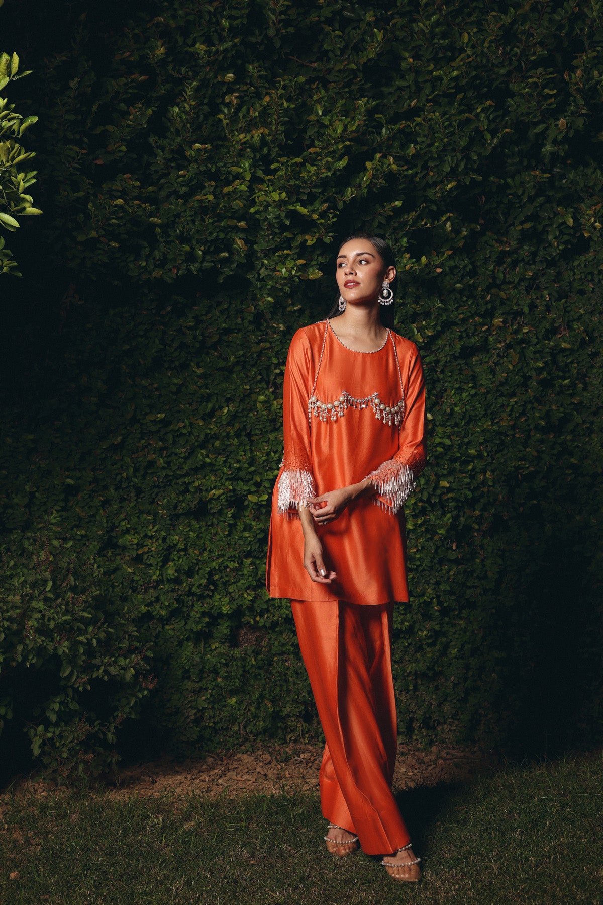 Tangerine silk Chanderi set featuring a relaxed straight-fit kurta with hand-embroidered pearl and crystal beadwork, accented by tassel details along the front. Designed with full sleeves finished in tube bead fringe and paired with a salwar and organza dupatta edged in delicate pearls radiant, graceful, and perfect for festive day celebrations.