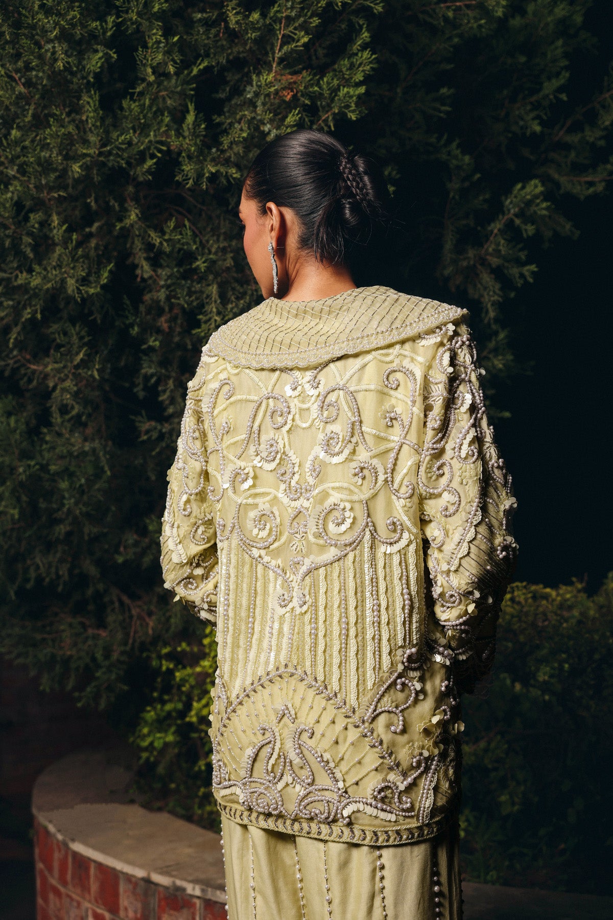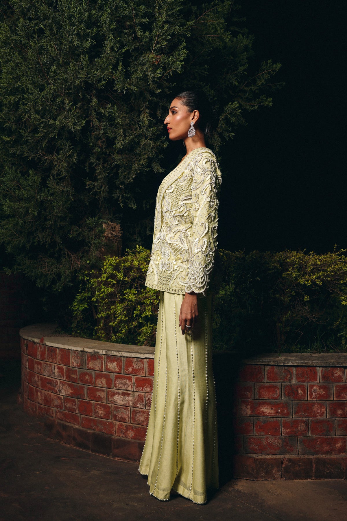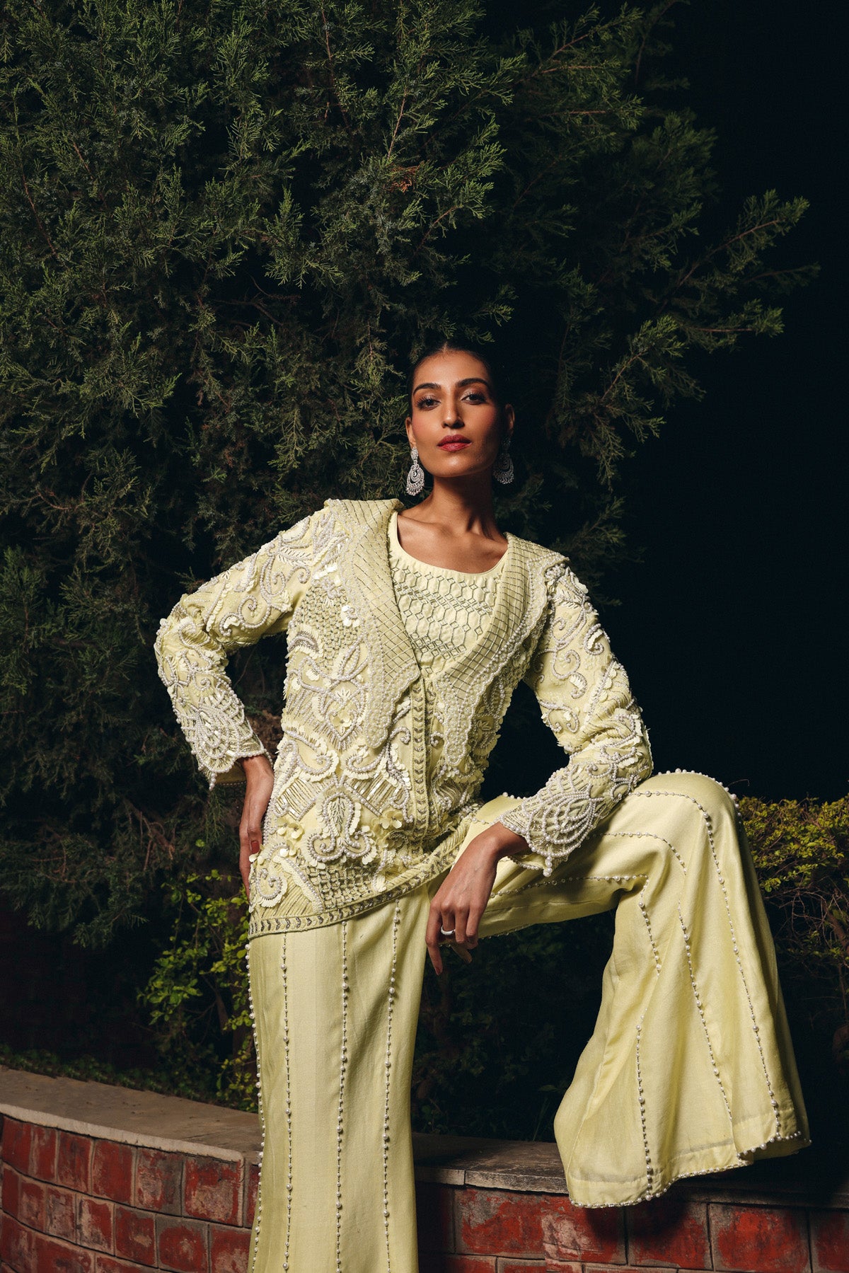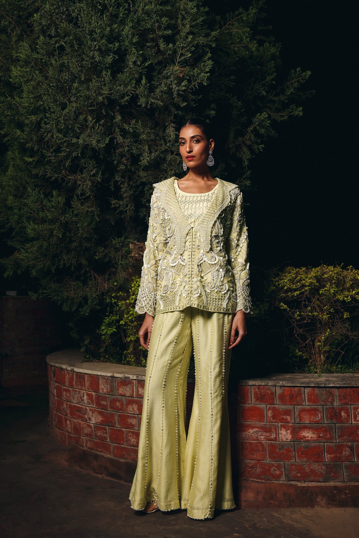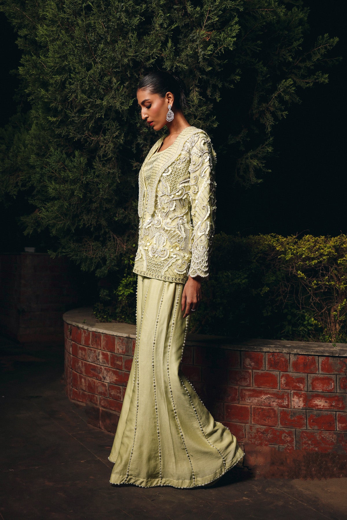 Mint Green silk Chanderi and organza set featuring a hand-embroidered long jacket adorned with intricate bead, sequin, and pearl work. Paired with an embroidered bustier and flared pants detailed with linear pearl embellishment a refined, modern ensemble perfect for festive and reception evenings.