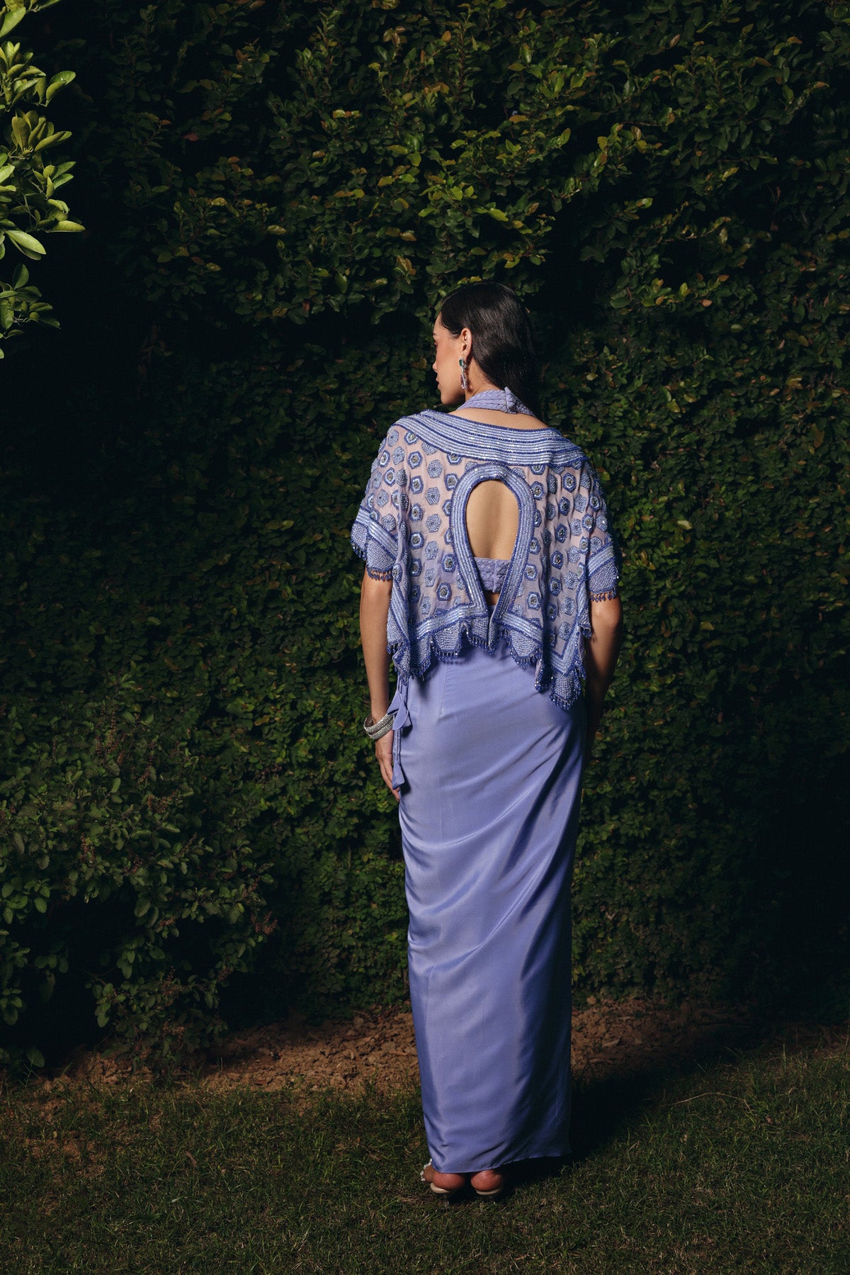 Denim Blue crepe set featuring a structured corset-style blouse with pleated detailing and a pre-stitched satin drape skirt gathered gracefully at the waist. Paired with a silk organza cape adorned in all-over beadwork and crystal highlights a statement ensemble blending modern allure with evening elegance.