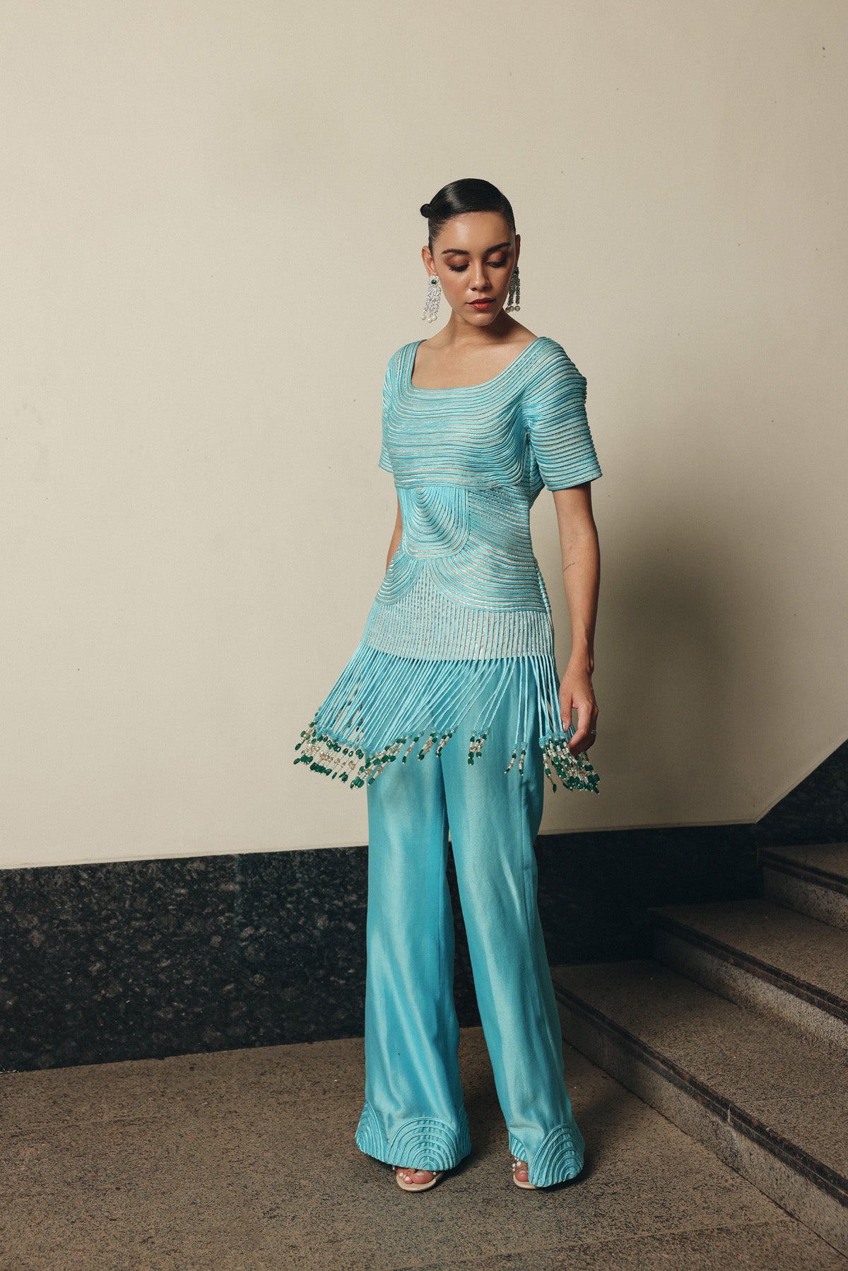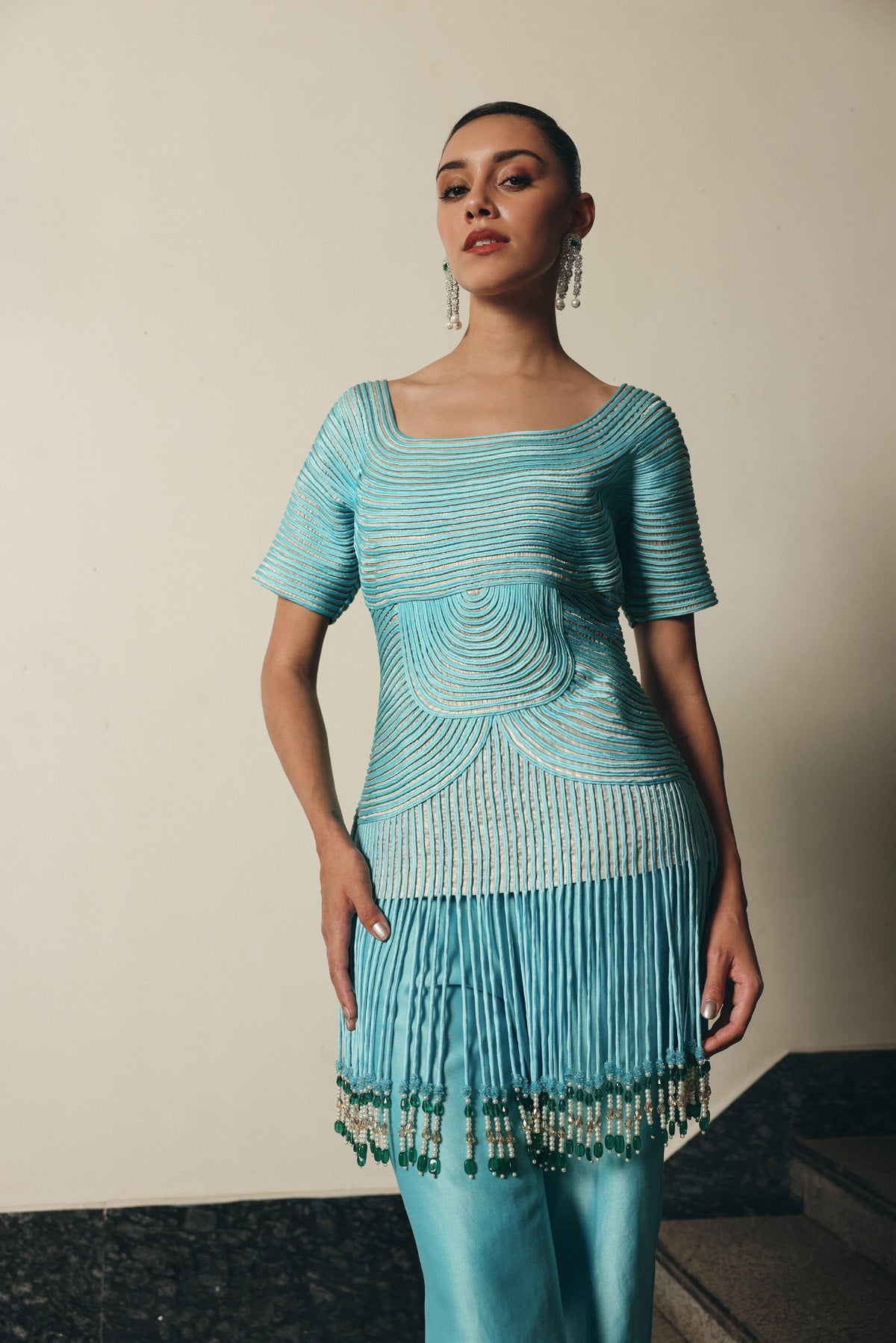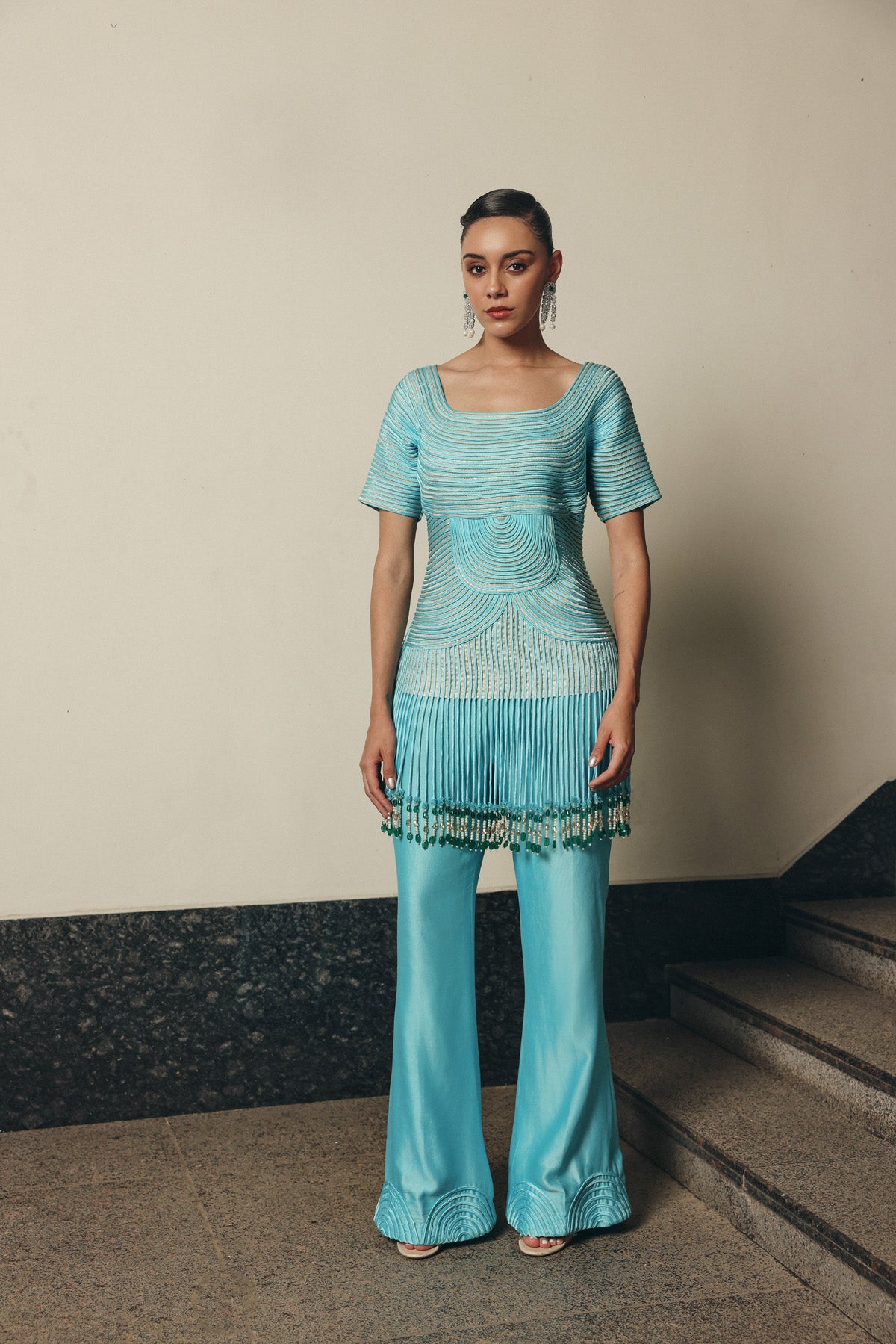 Sea Blue silk Chanderi set featuring a circular tunic with all-over dori embroidery and pearl-bead tassel detailing along the hem. Paired with flared embroidered pants a graceful, festive ensemble perfect for cocktail evenings and celebration soires.