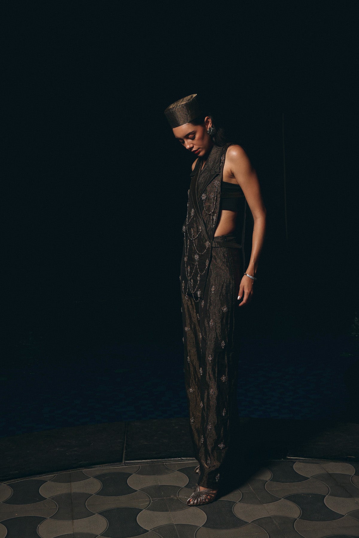 Black Gold textured tissue set featuring a sleeveless jacket-style blouse with a lapel collar and intricate crystal chain and bead embroidery forming cascading patterns. Paired with coordinated embroidered trousers and a matching headpiece a bold, tailored silhouette perfect for cocktail nights and modern festive soirées.