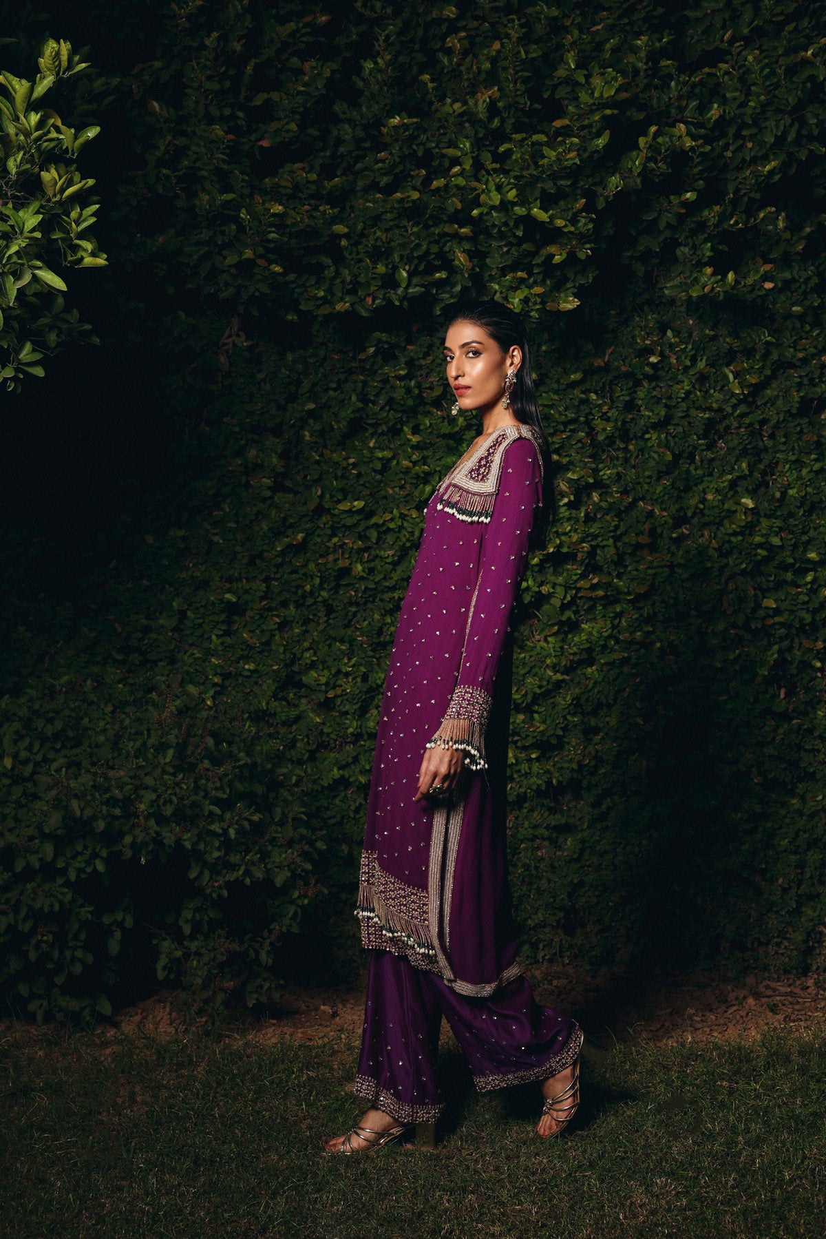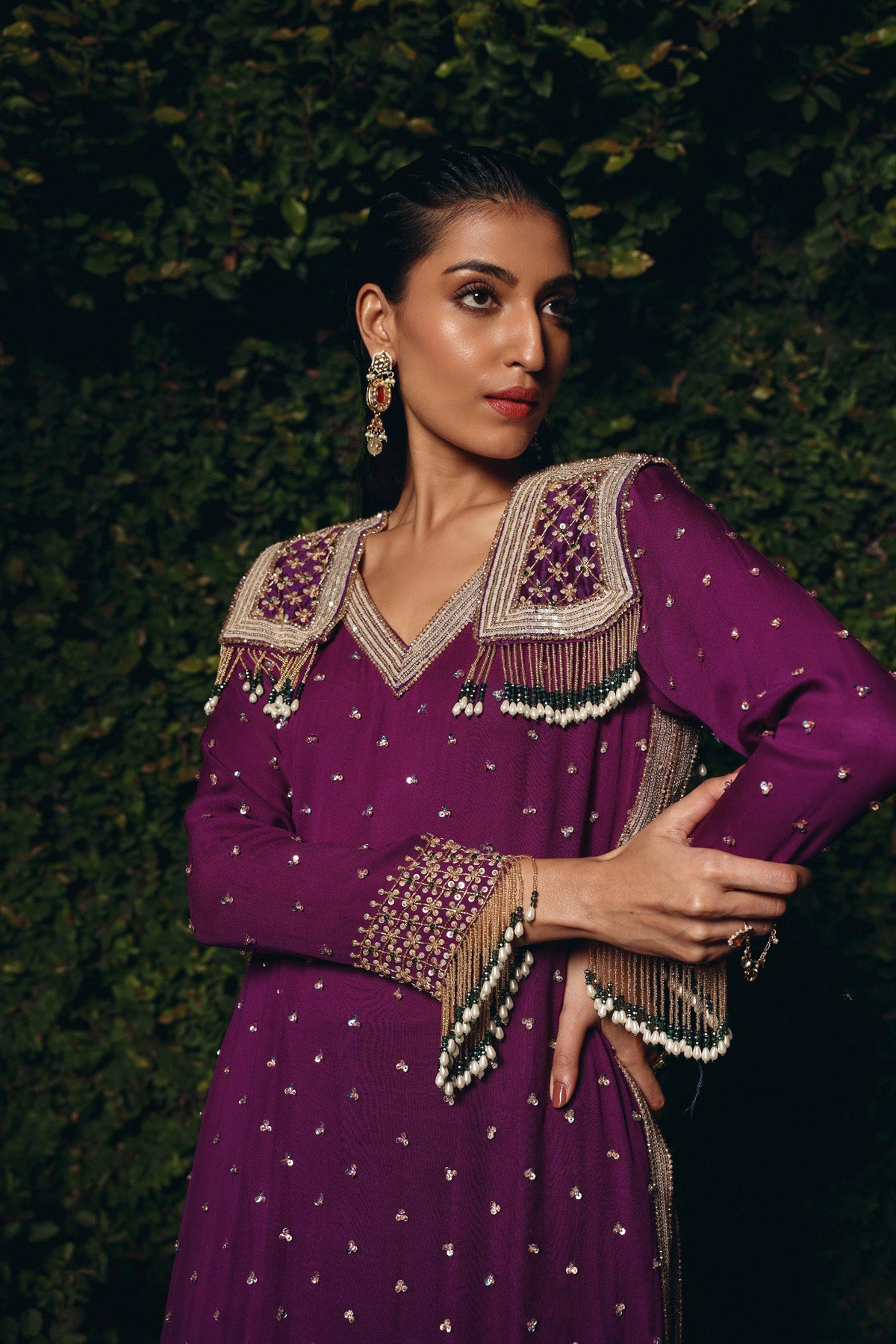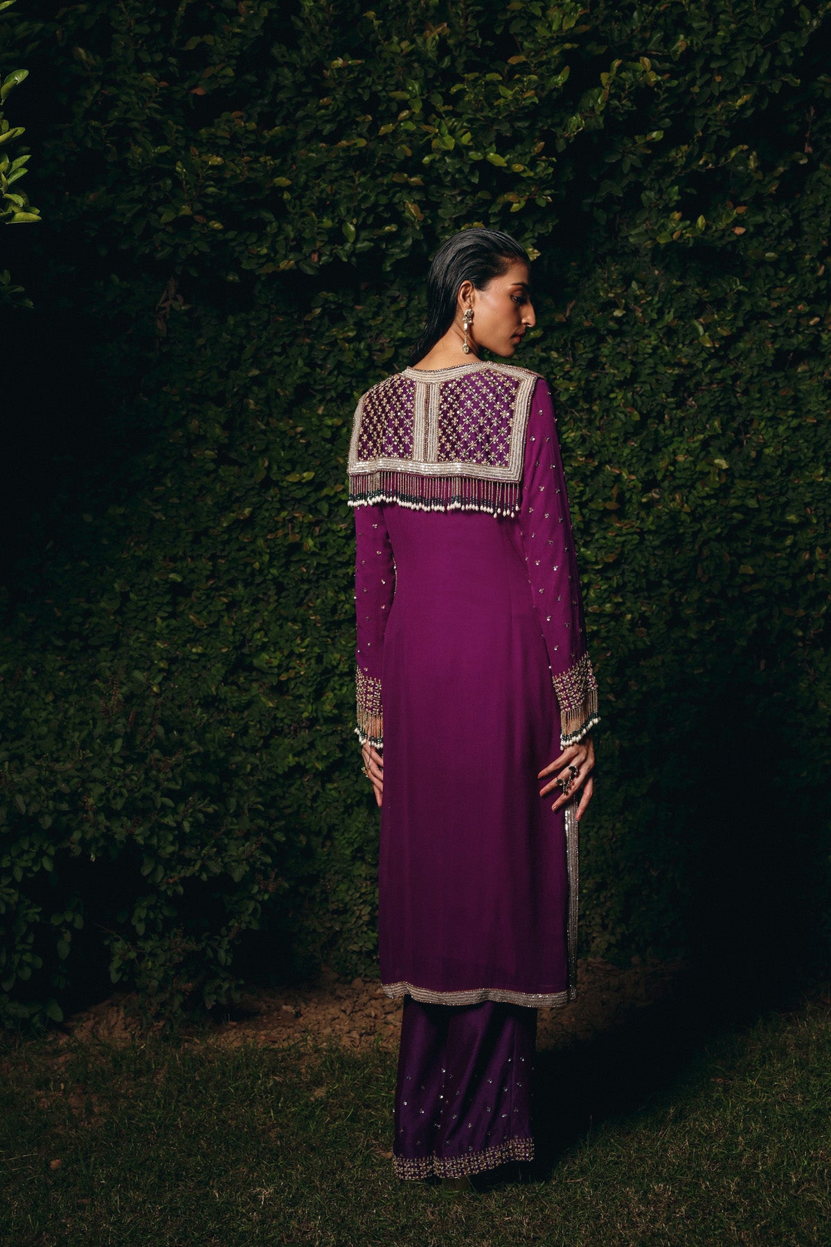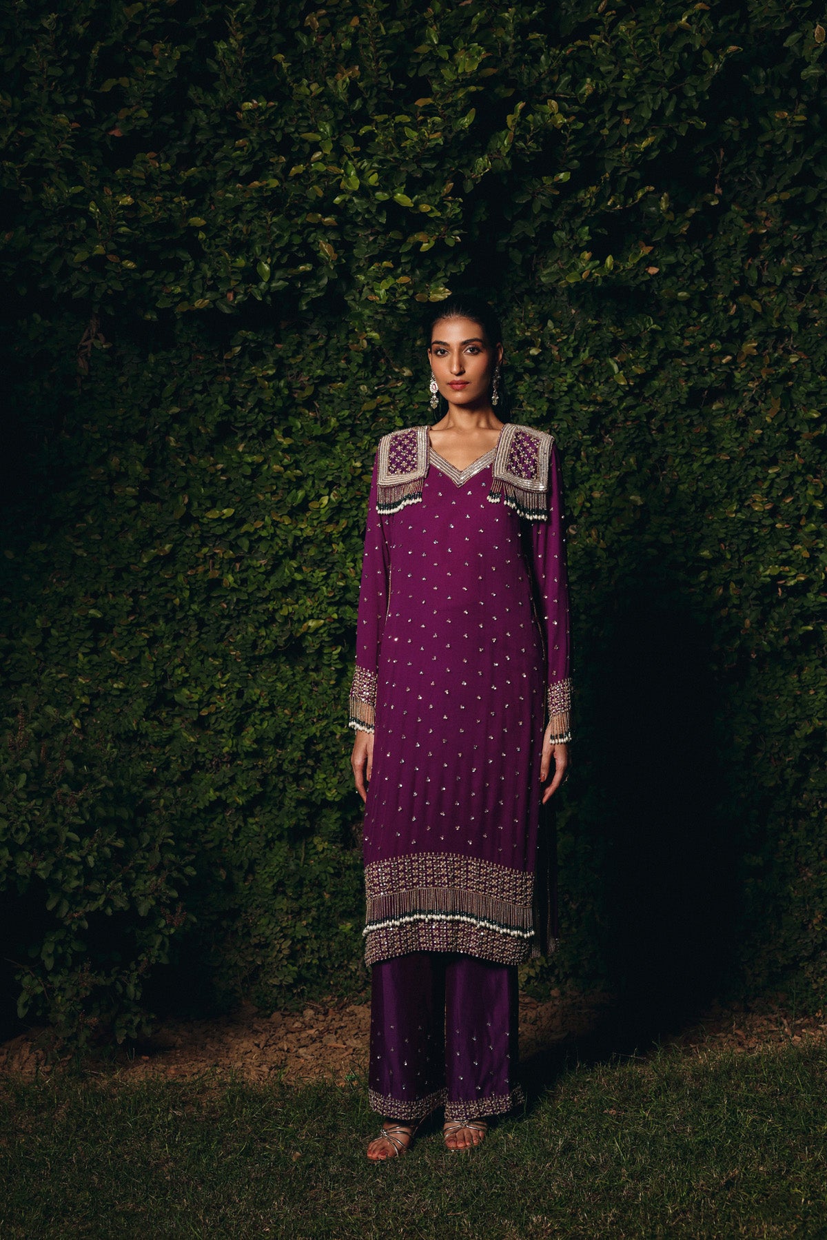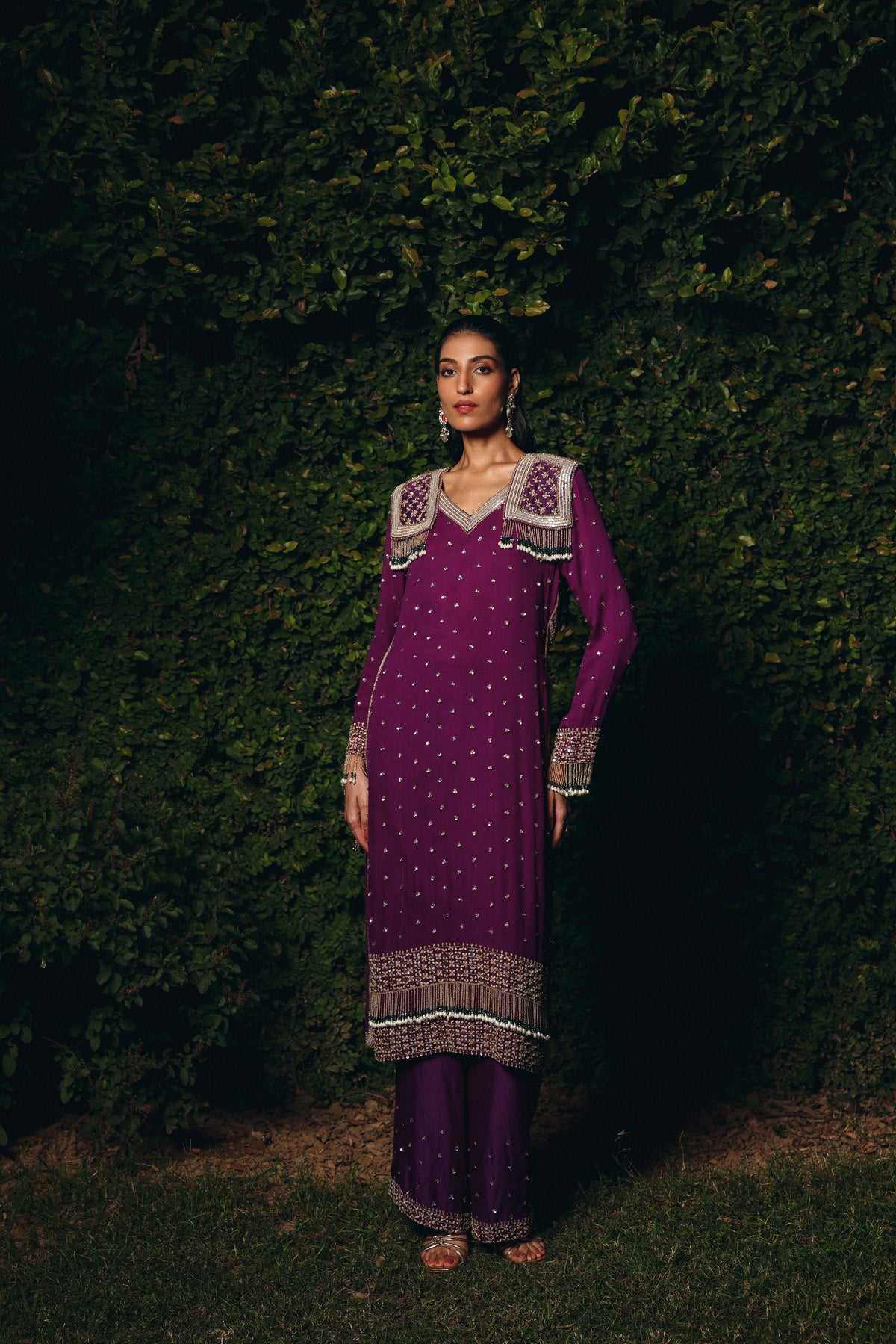 Deep Plum georgette set featuring a straight-fit kurta adorned with sequin motifs, bead, and tassel embroidery across the neckline, hem, and sleeves. Paired with matching embroidered pants a refined, festive ensemble ideal for wedding celebrations and reception nights.