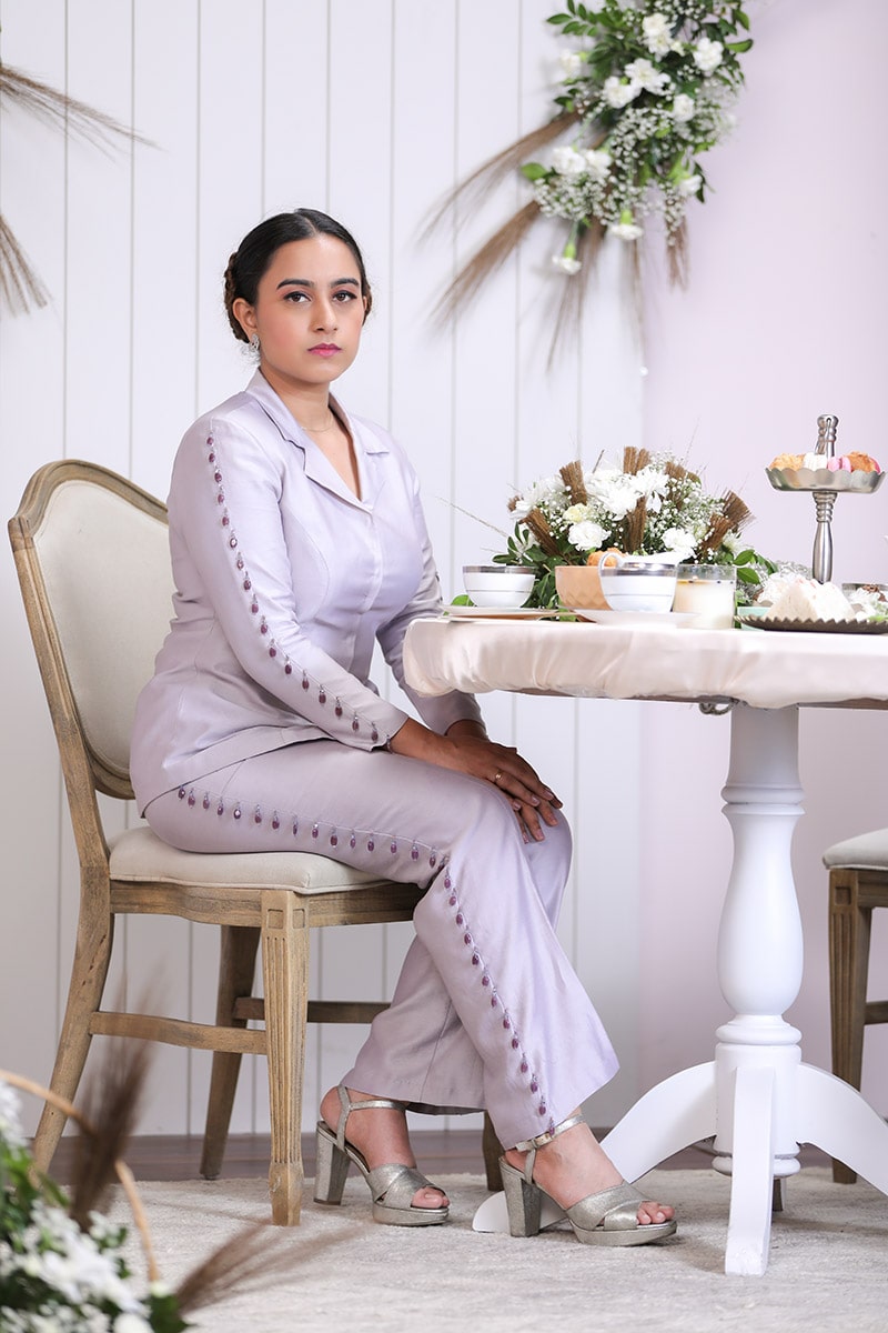 A Powerful Grey Pant Suit with purple tassel embroidery crafted in Chanderi silk.