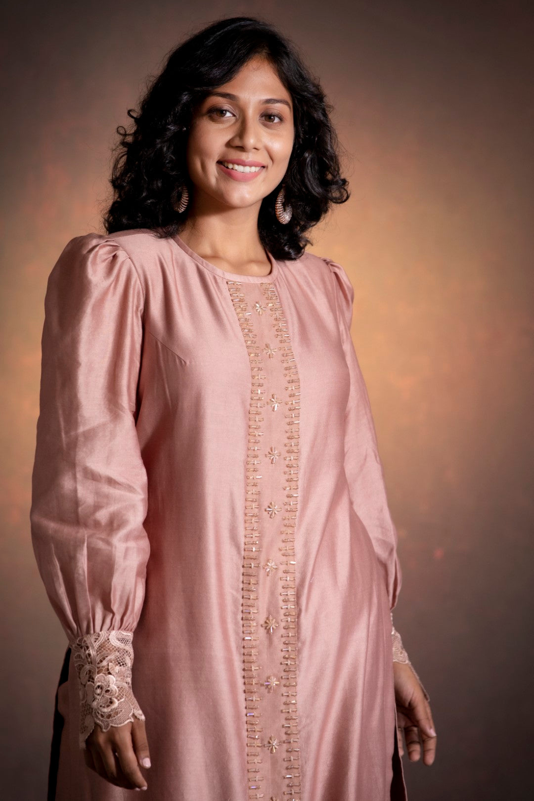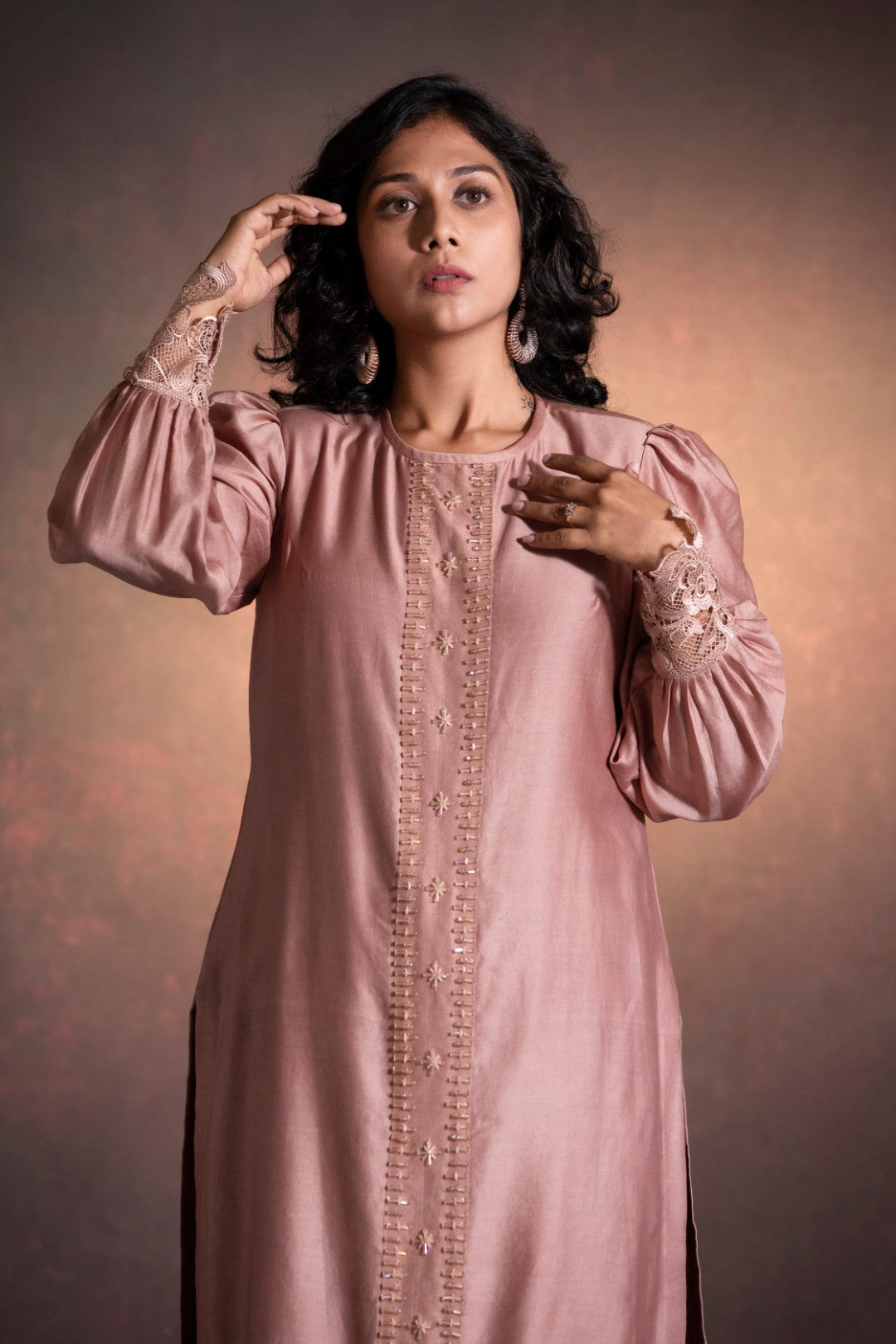 A tunic and pants set with lace cuffs and an embroidered centre panel for a dignified and respectful look. Fashioned in dark beige Chanderi silk.