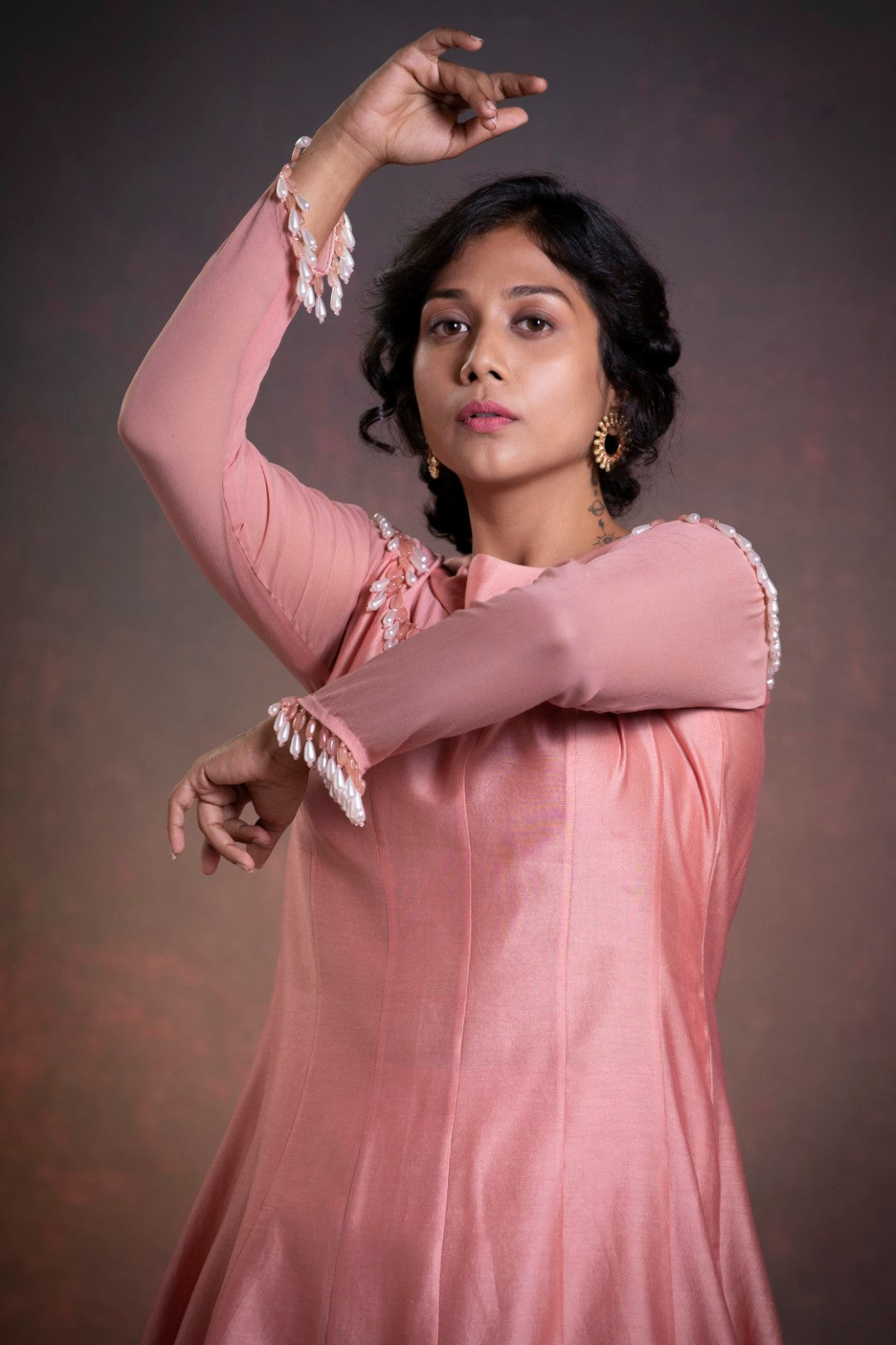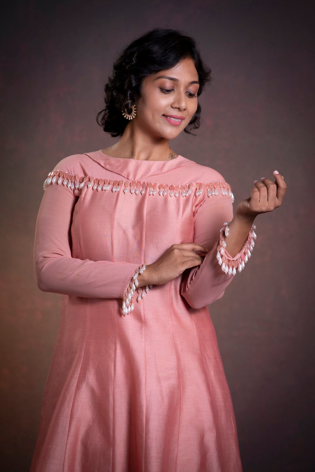 A gorgeous and chic pastel pink Anarkali with tassels at the sleeves and around below the neck line.
