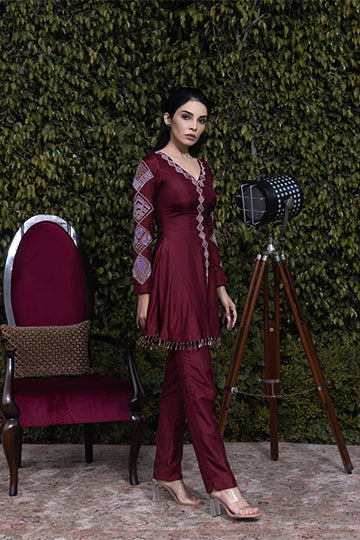 Handcrafted in Silk, this kurta and peplum pant with tassels on the hem is embroidered with sheer ingenuity and royal panache.