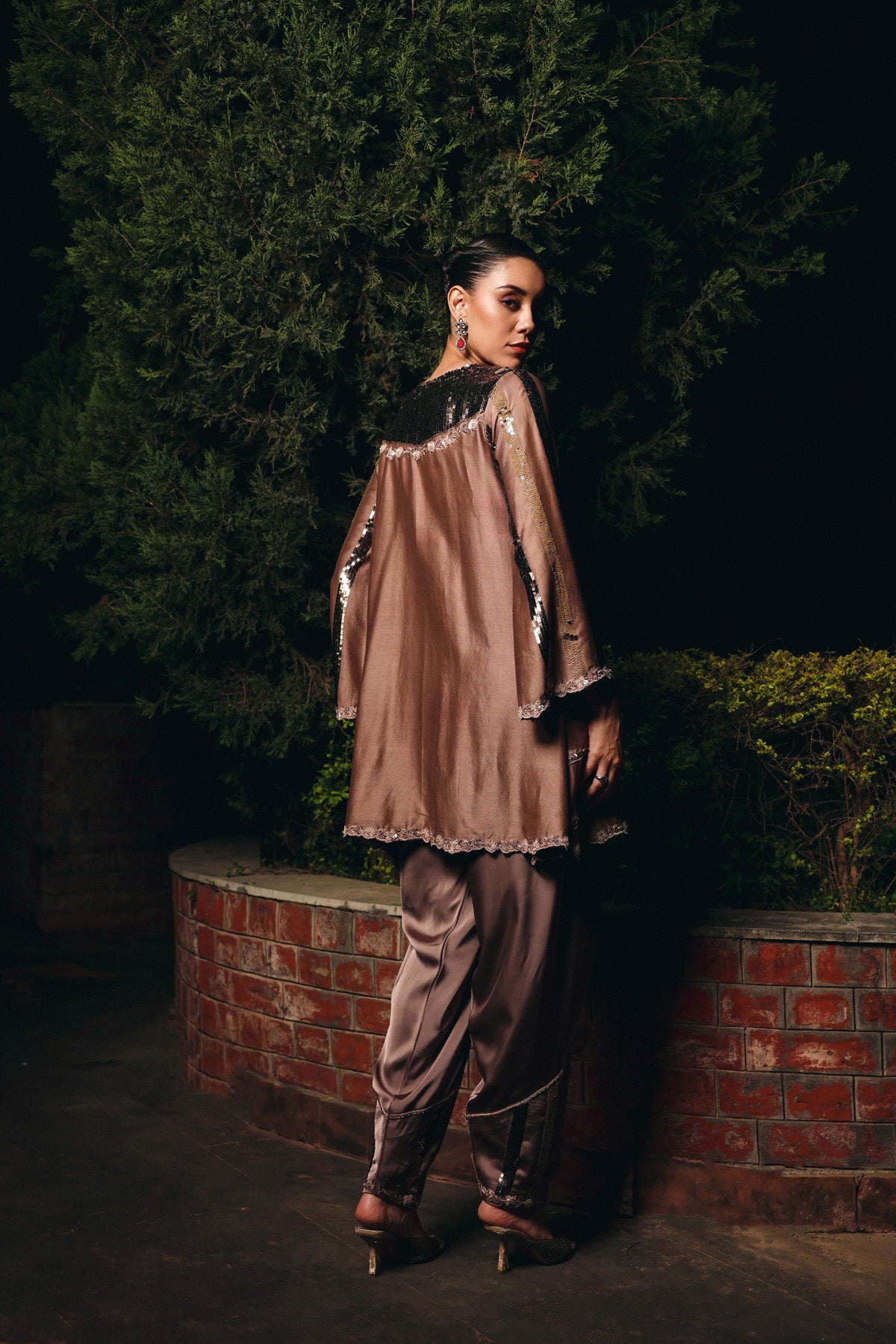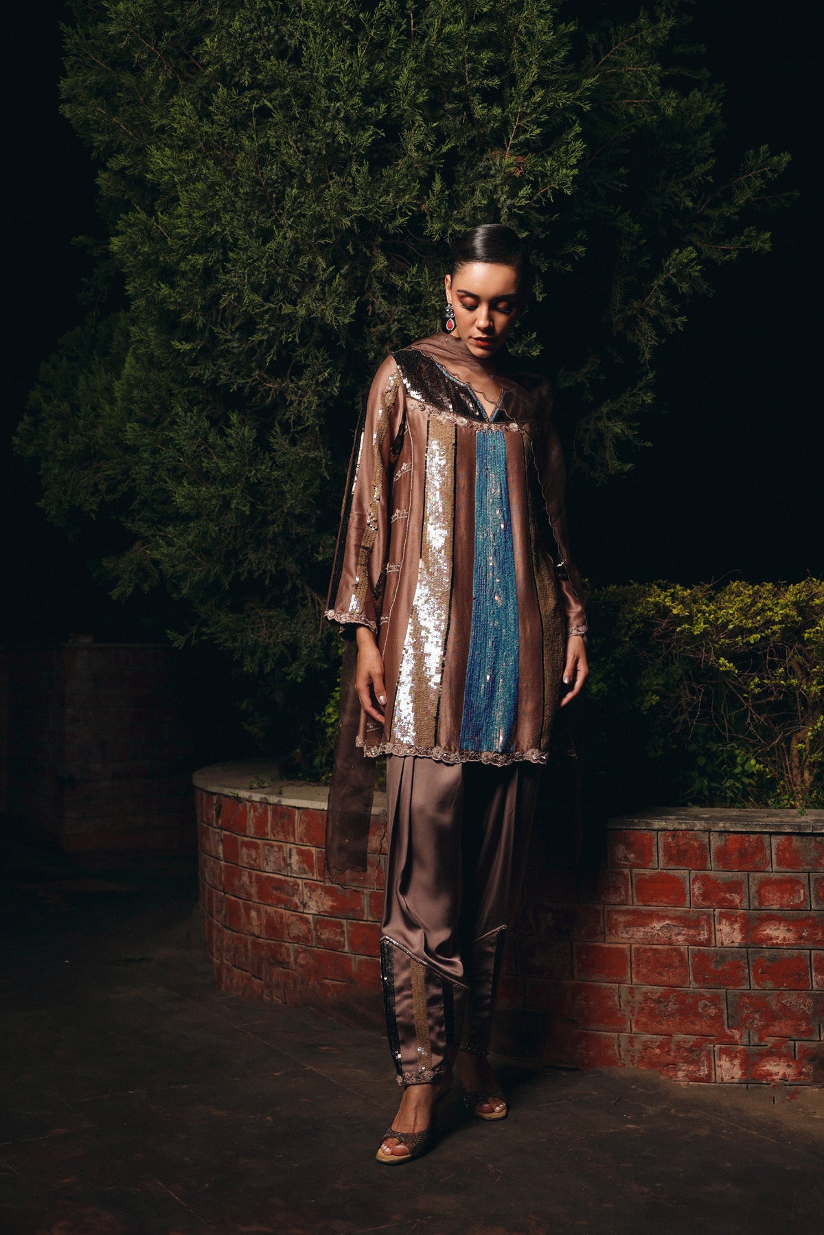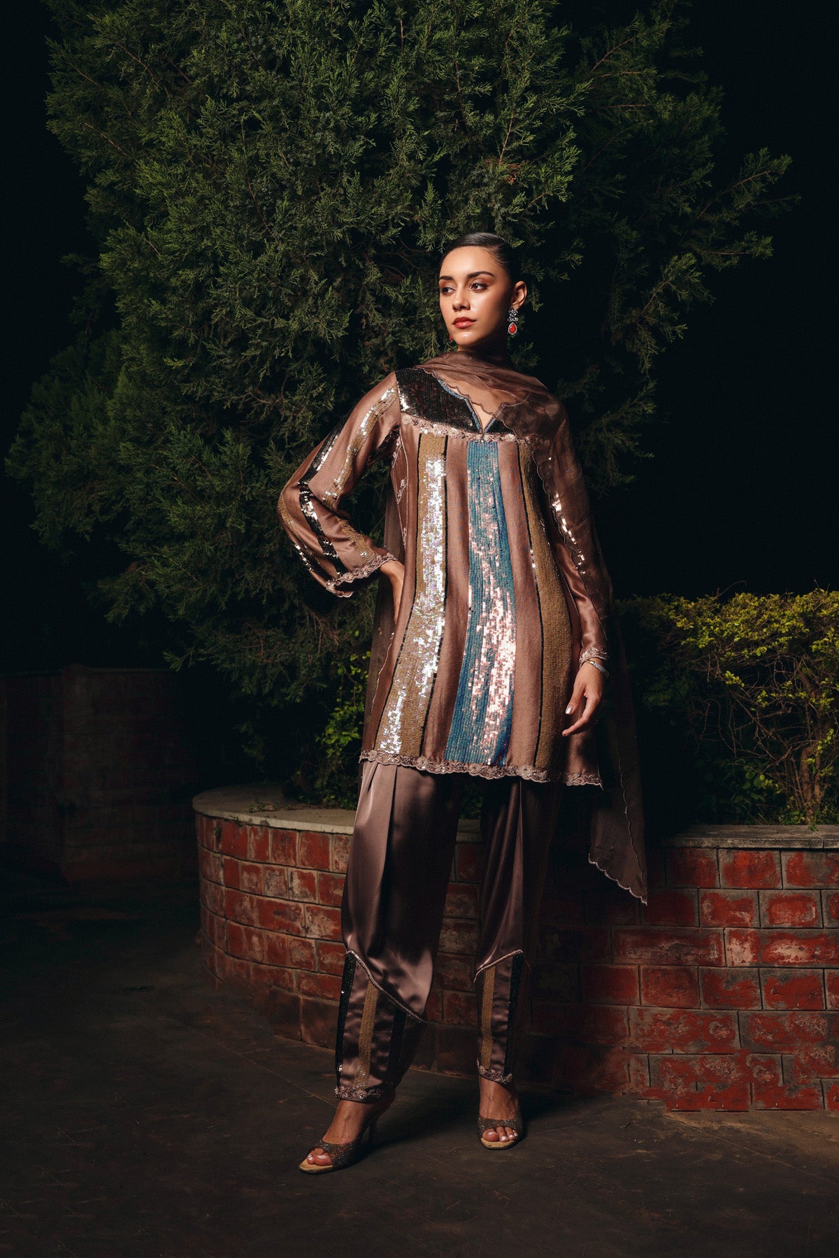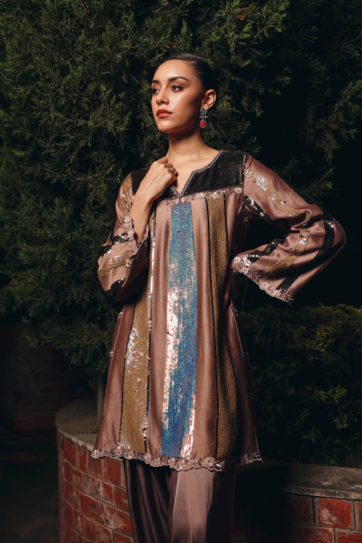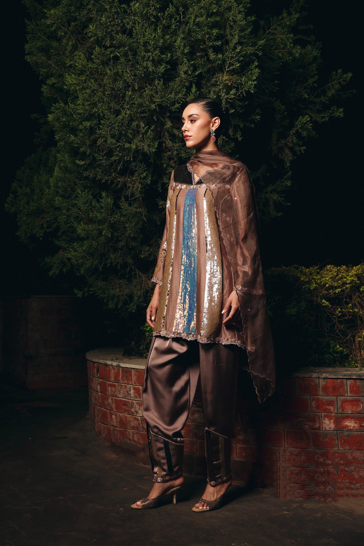 Mocha silk Chanderi set featuring a relaxed-fit kurta with vertical sequin and metallic thread embroidery in tonal and contrast blue accents. Paired with coordinated satin trousers detailed with embellished hems a chic, contemporary look for festive evenings and cocktail celebrations.