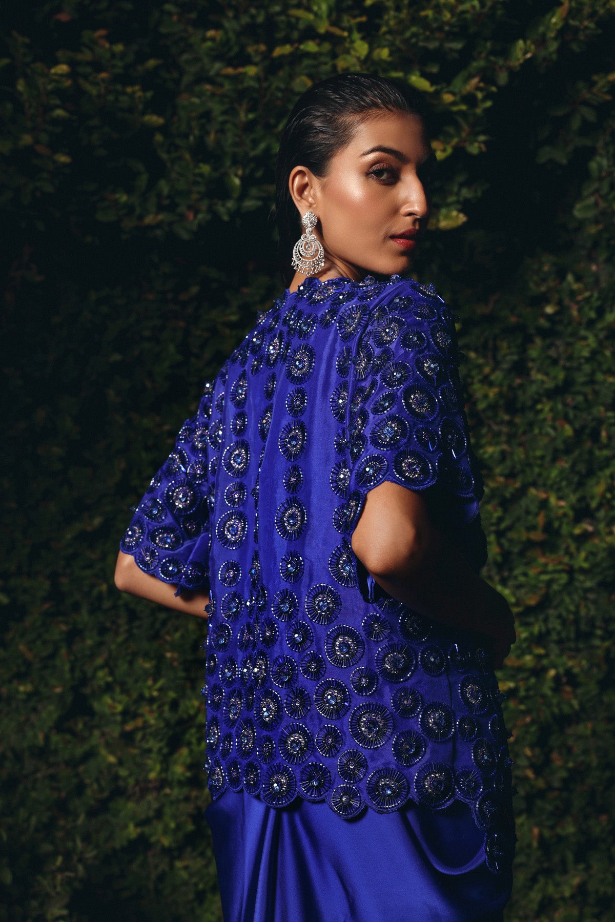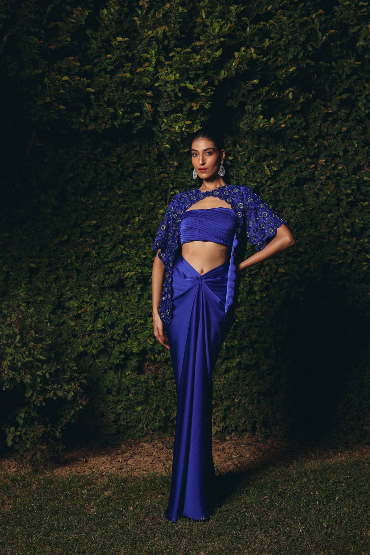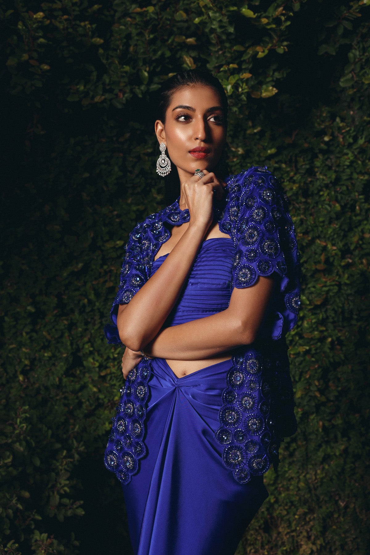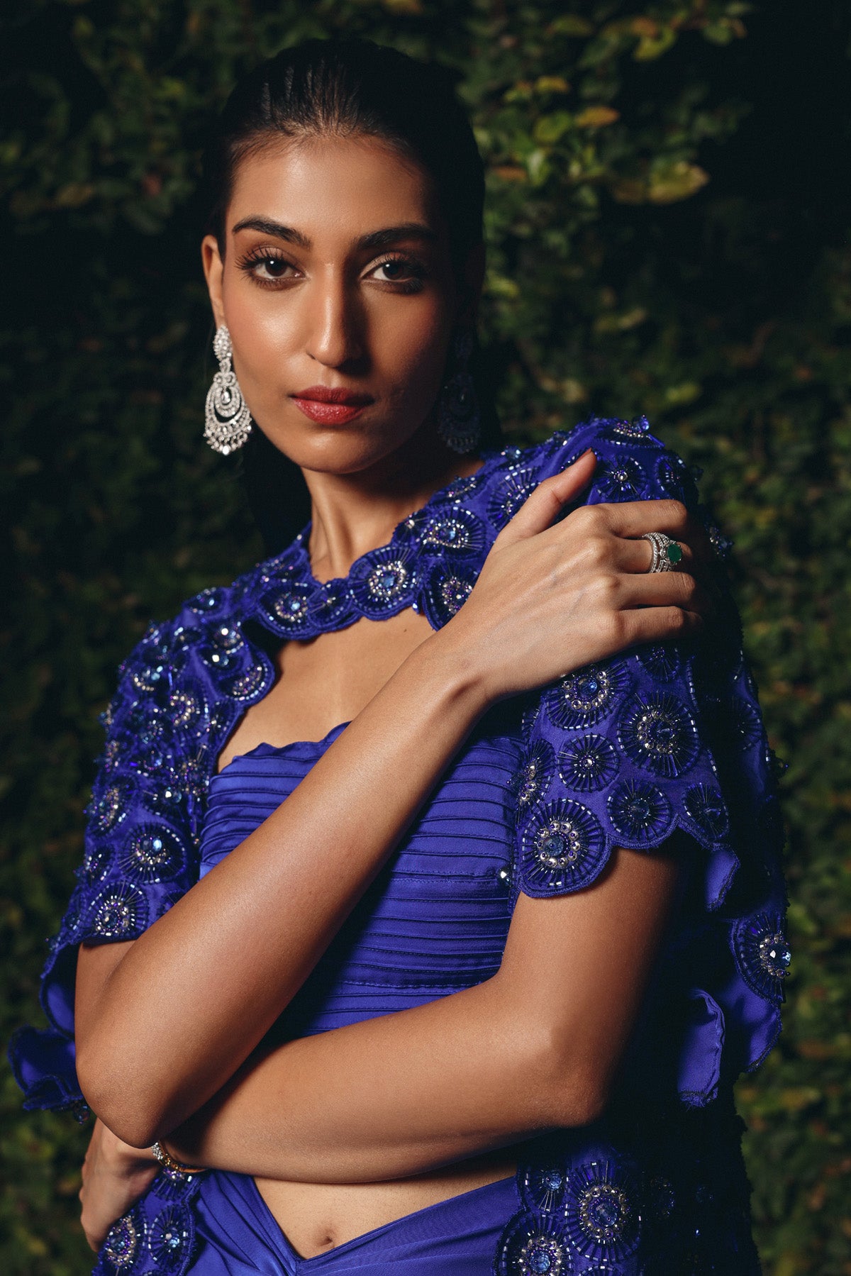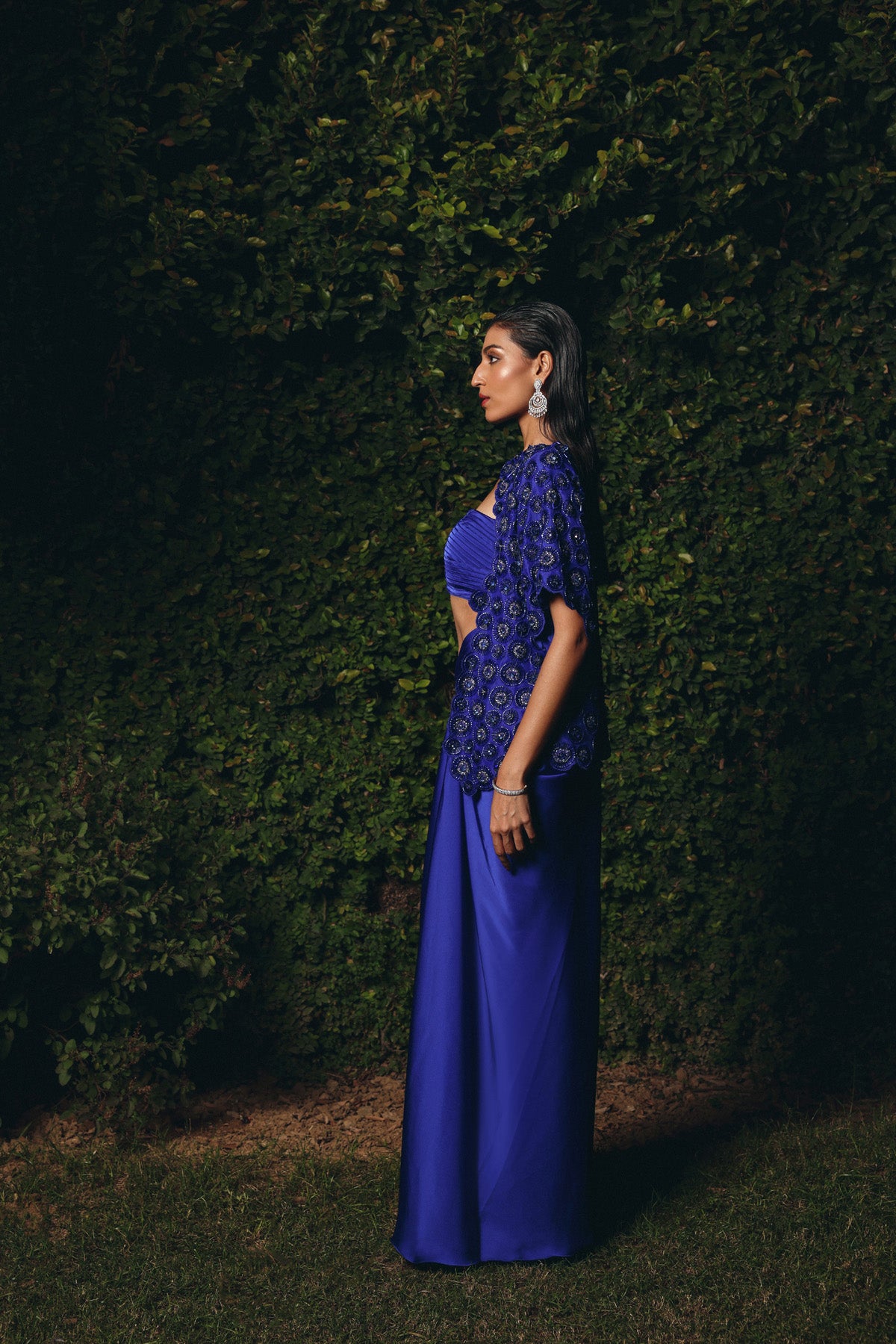 Royal Blue satin silk set featuring a structured pleated strap blouse paired with a pre-stitched drape saree showcasing elegant front knot pleating. Layered with a sheer organza cape adorned with hand-embroidered beads and sequins a refined draped silhouette designed for cocktail, reception, and evening elegance.