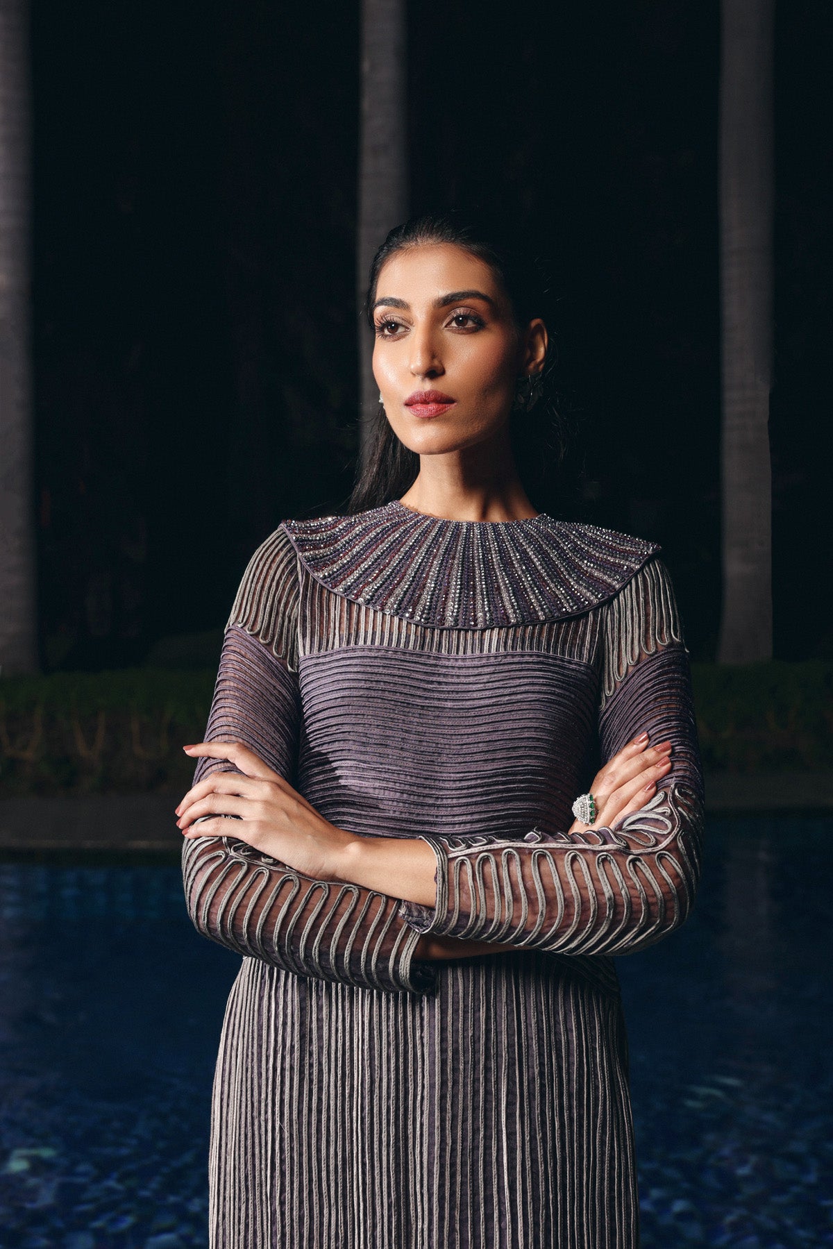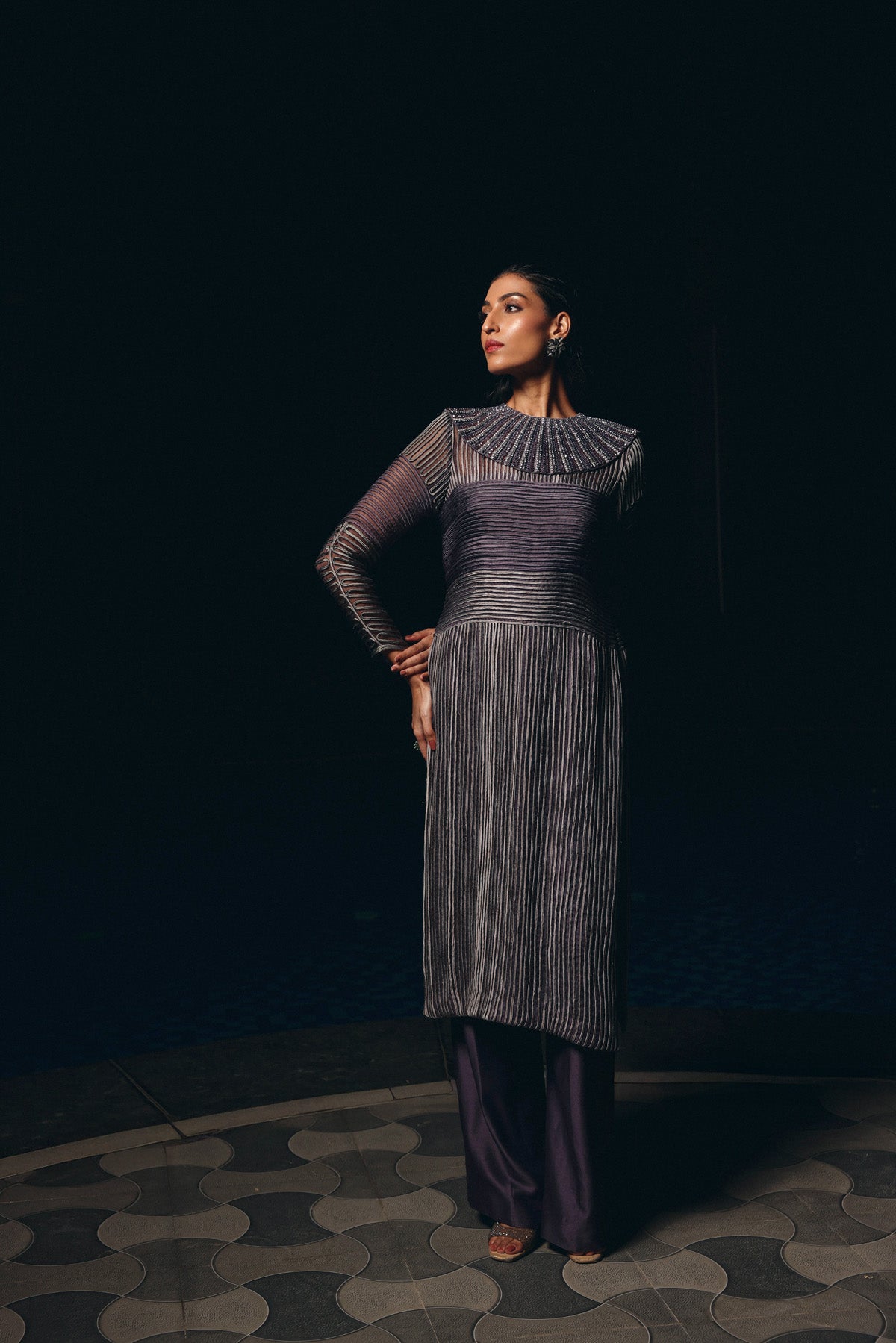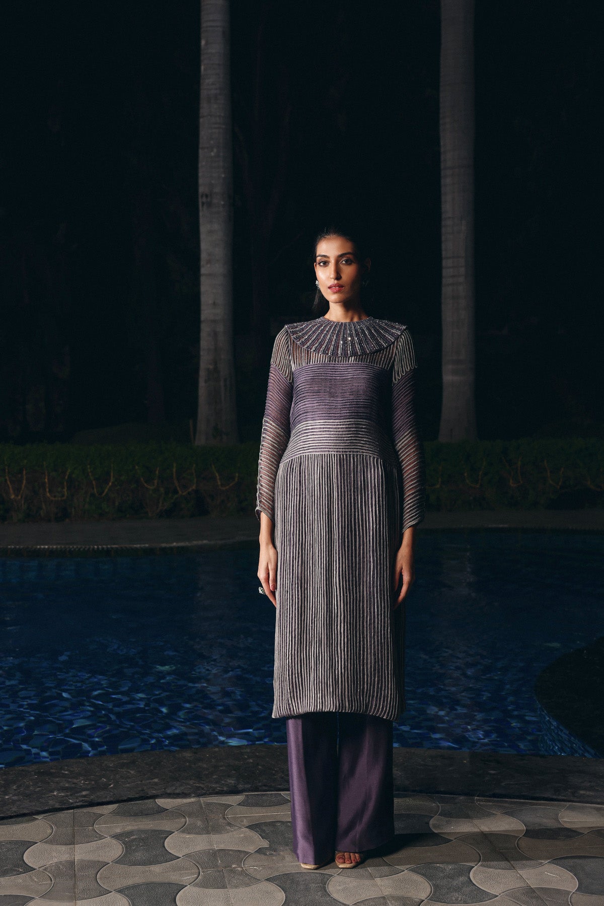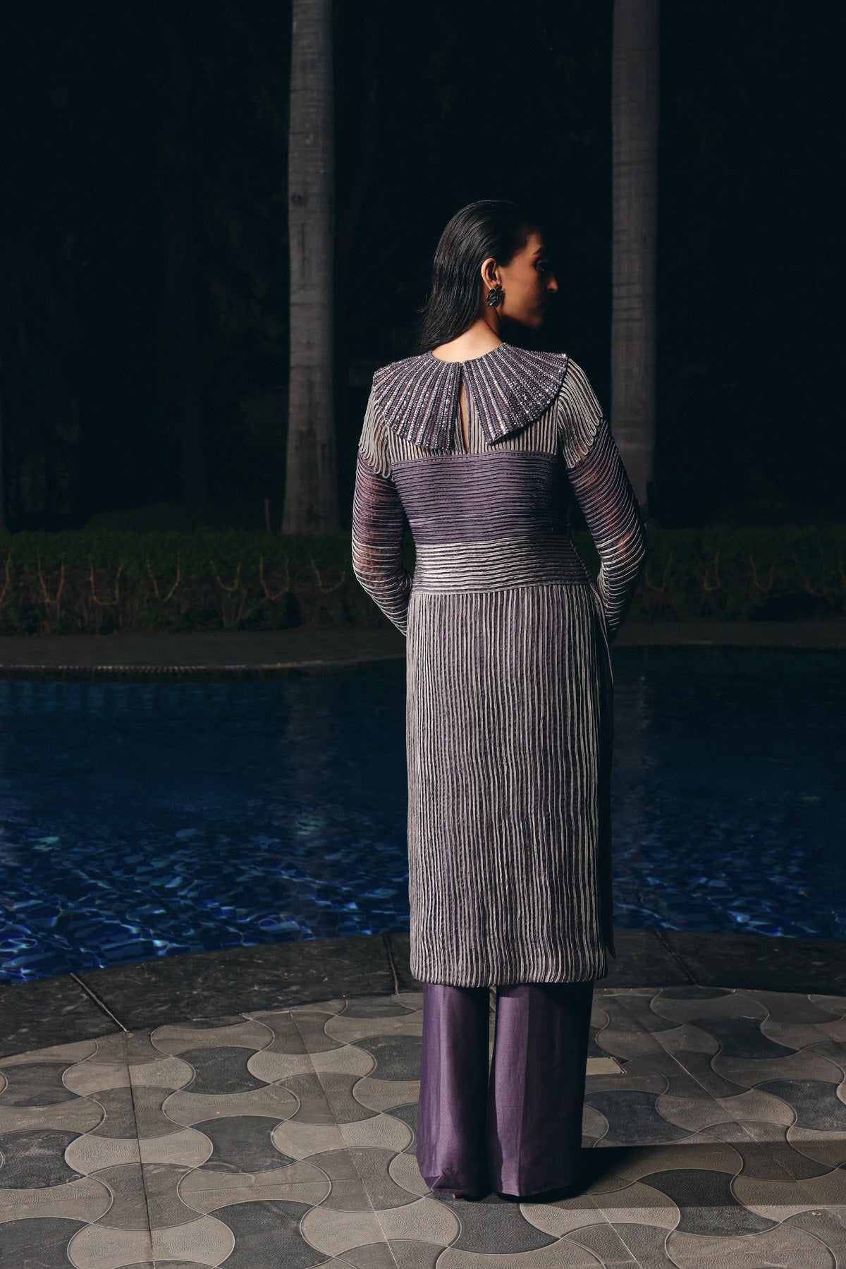 Charcoal Mauve organza and silk Chanderi set featuring a structured long kurta with linear dori embroidery and metallic highlights. Designed with sheer full sleeves and a detachable embroidered neckline, paired with matching straight-fit silk pants a refined, contemporary look for formal and festive evenings.