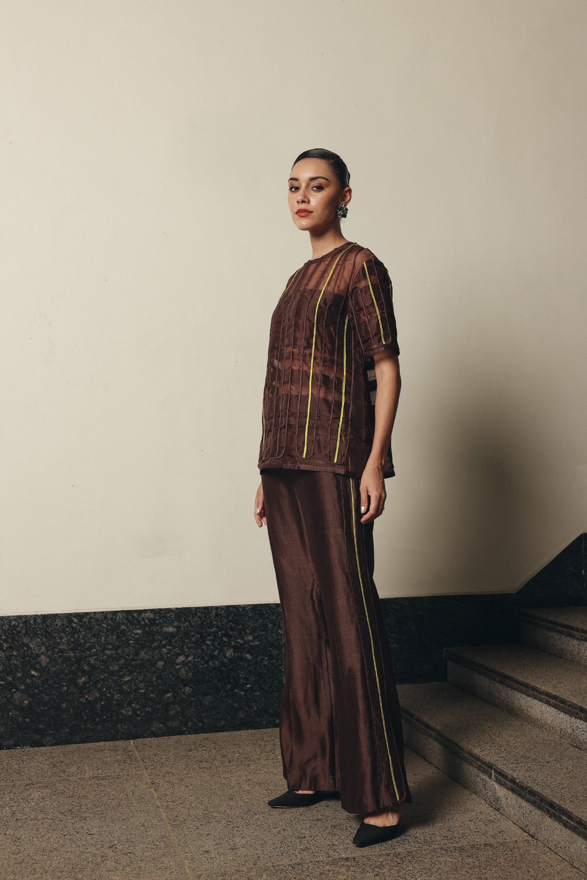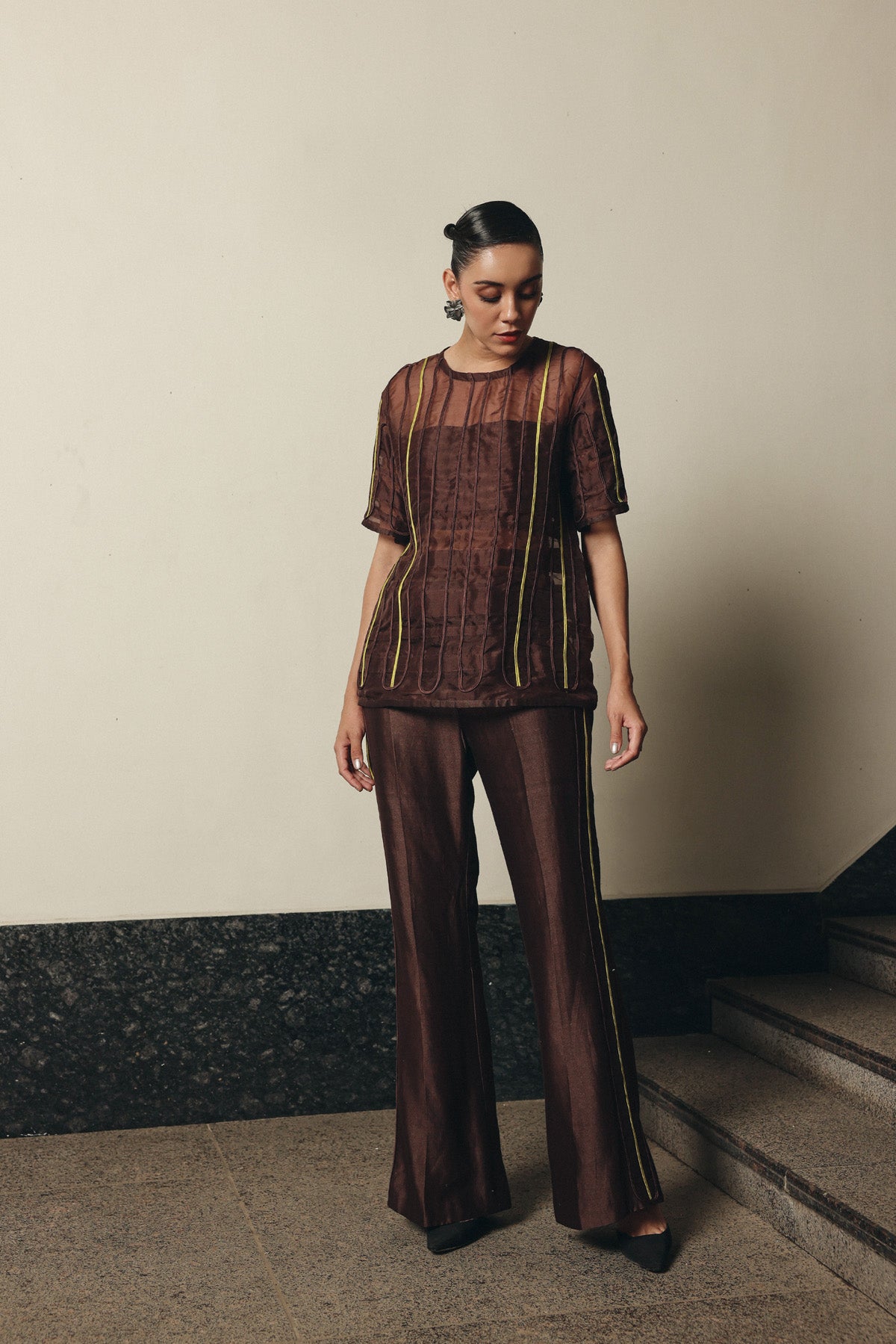 Mocha silk Chanderi and organza set featuring a sheer overlay top with vertical textured panels and contrast neon piping. Paired with straight-fit silk trousers a subtly detailed, relaxed yet structured ensemble ideal for contemporary festive and formal evenings.