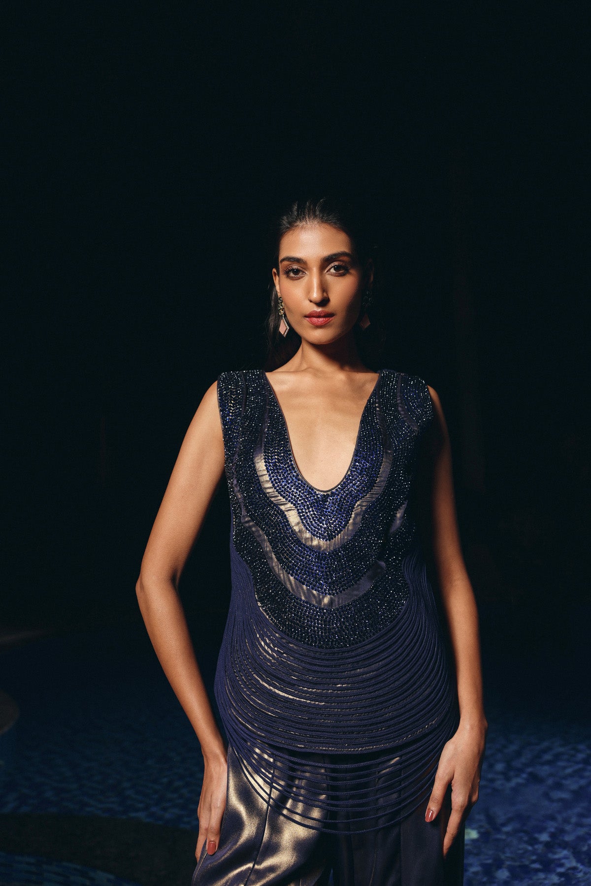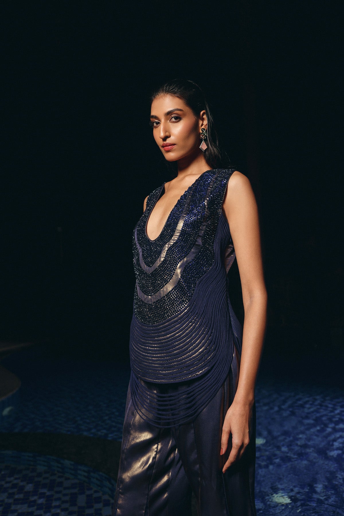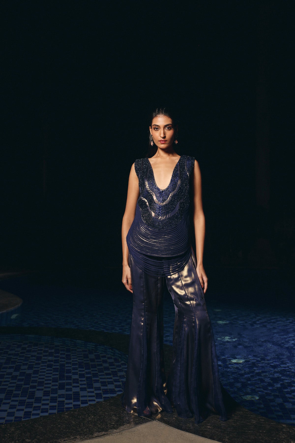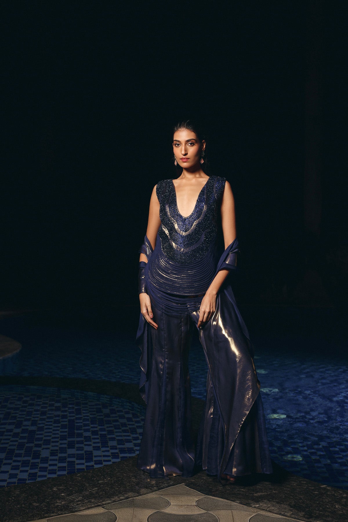 Midnight Blue metallic georgette set featuring a hand-embroidered sleeveless blouse adorned with layered beads and glass crystals. Paired with flared metallic kali pants detailed with organza and draped satin panels for added fluidity a sculpted, contemporary ensemble perfect for cocktail and reception evenings.