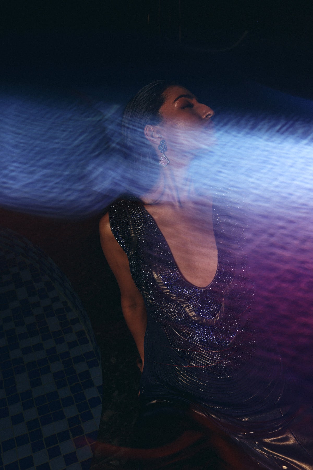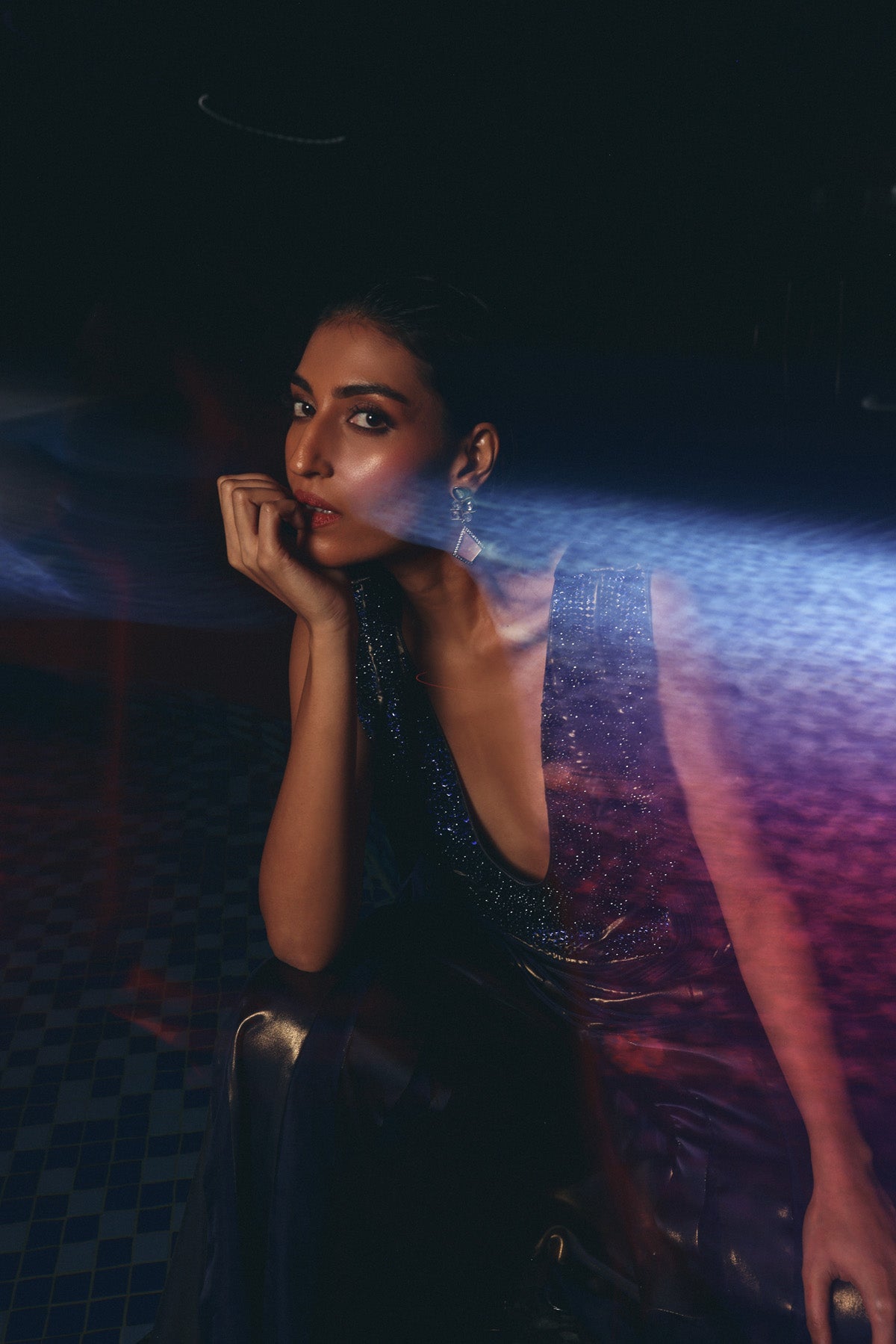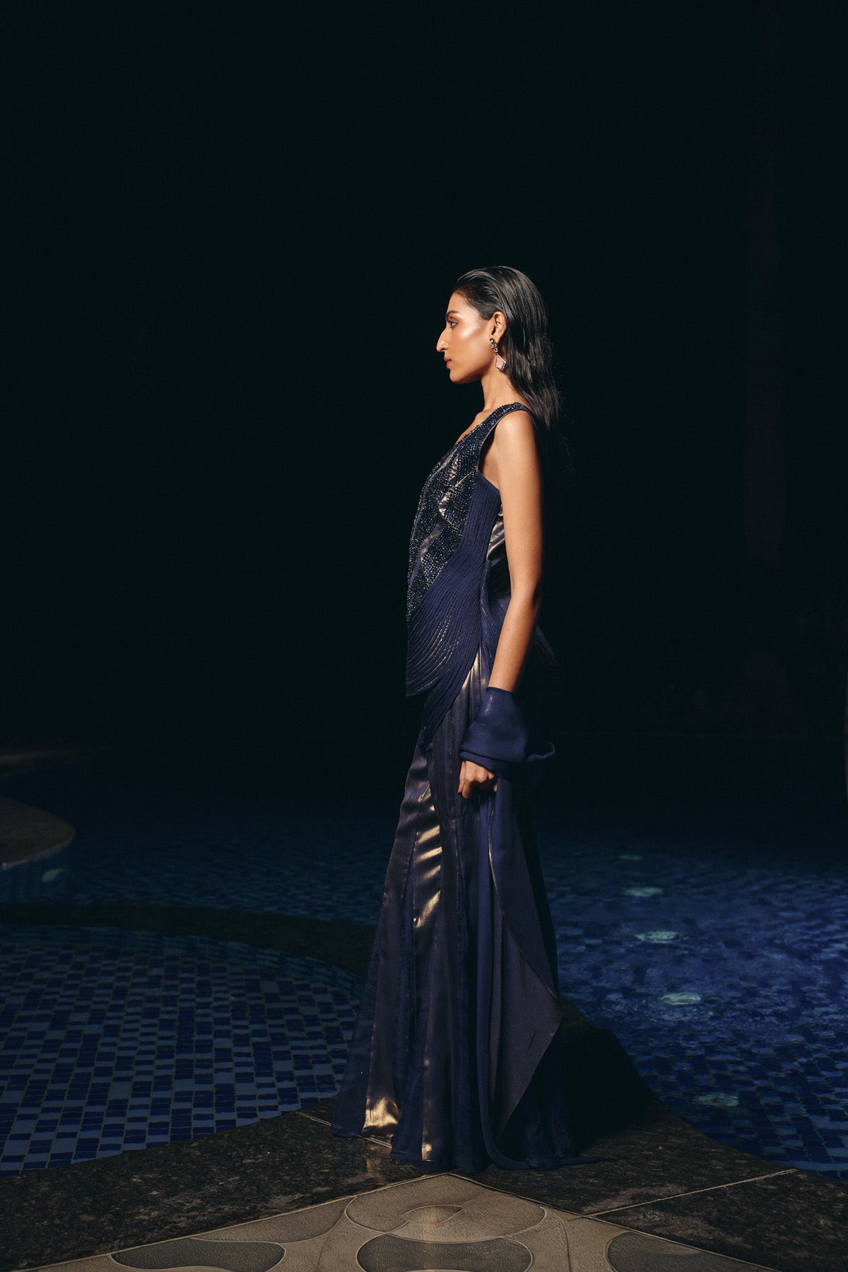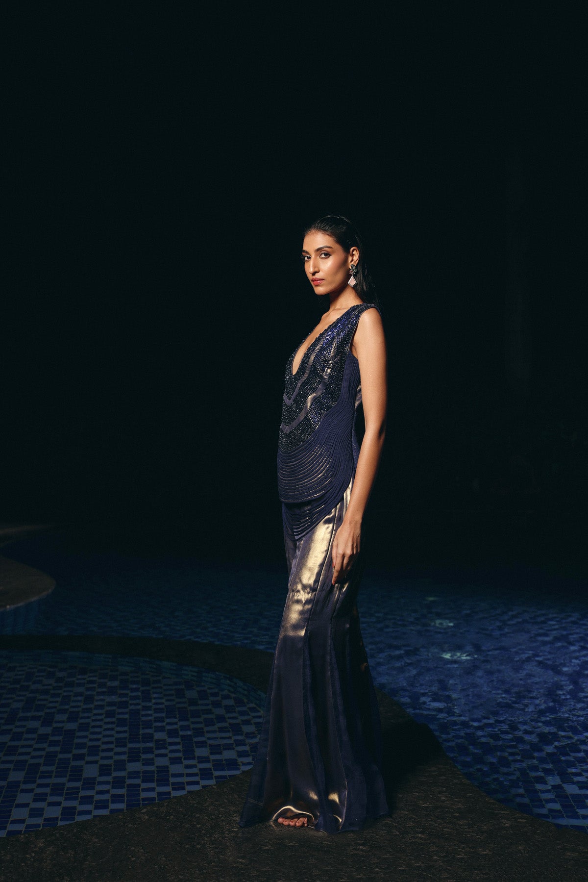 Midnight Blue metallic georgette set featuring a hand-embroidered sleeveless blouse adorned with layered beads and glass crystals. Paired with flared metallic kali pants detailed with organza and draped satin panels for added fluidity a sculpted, contemporary ensemble perfect for cocktail and reception evenings.