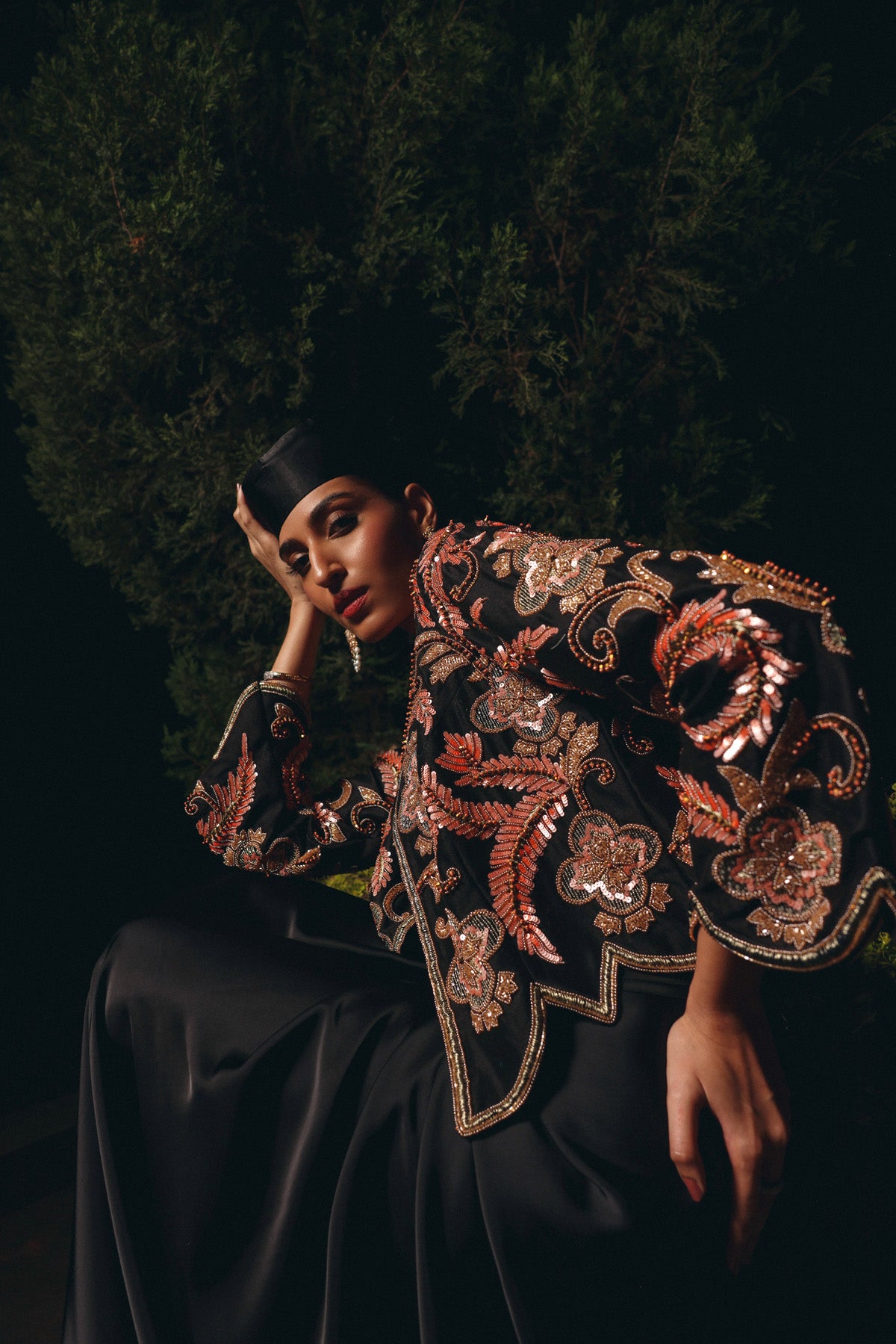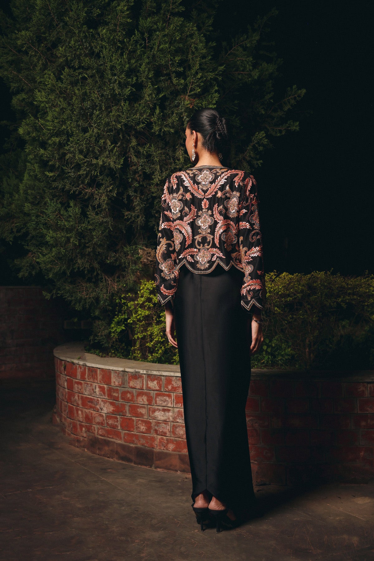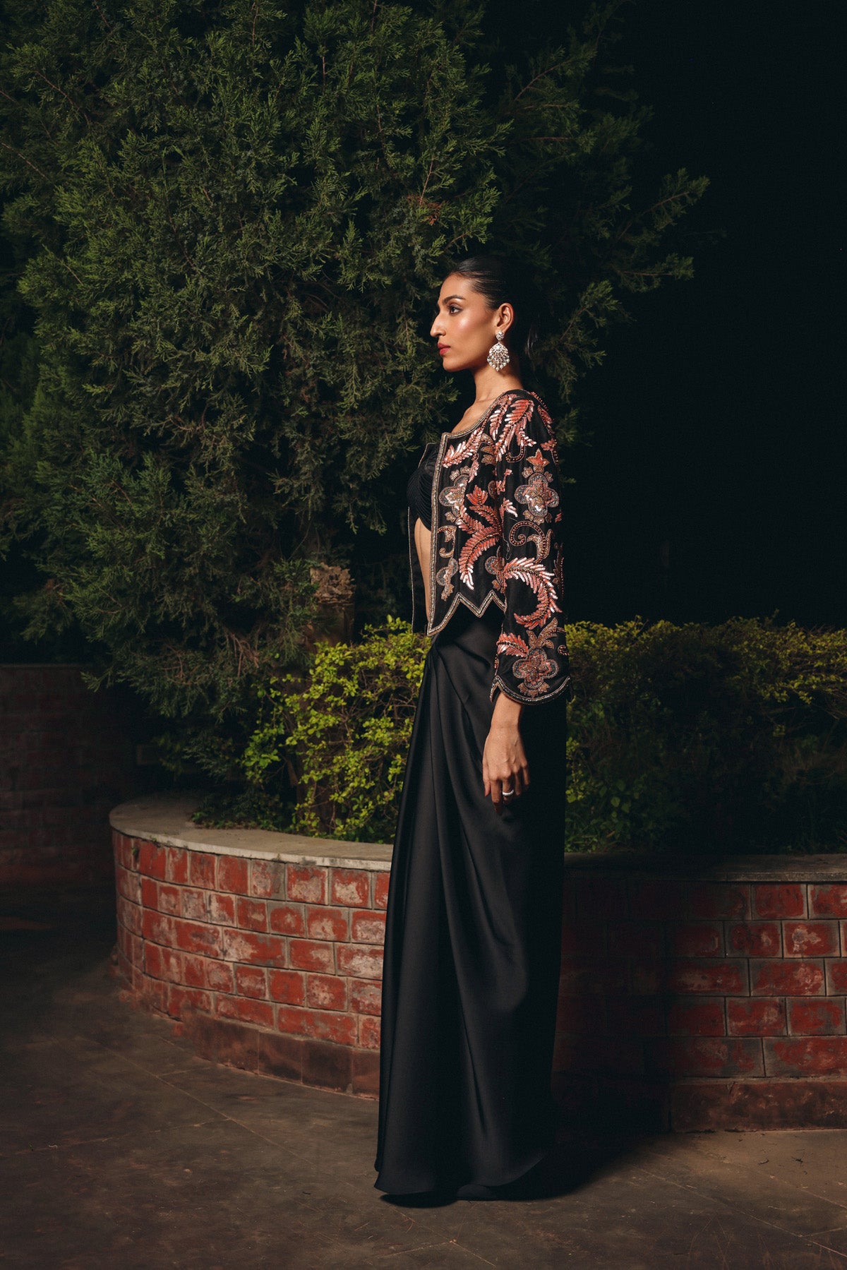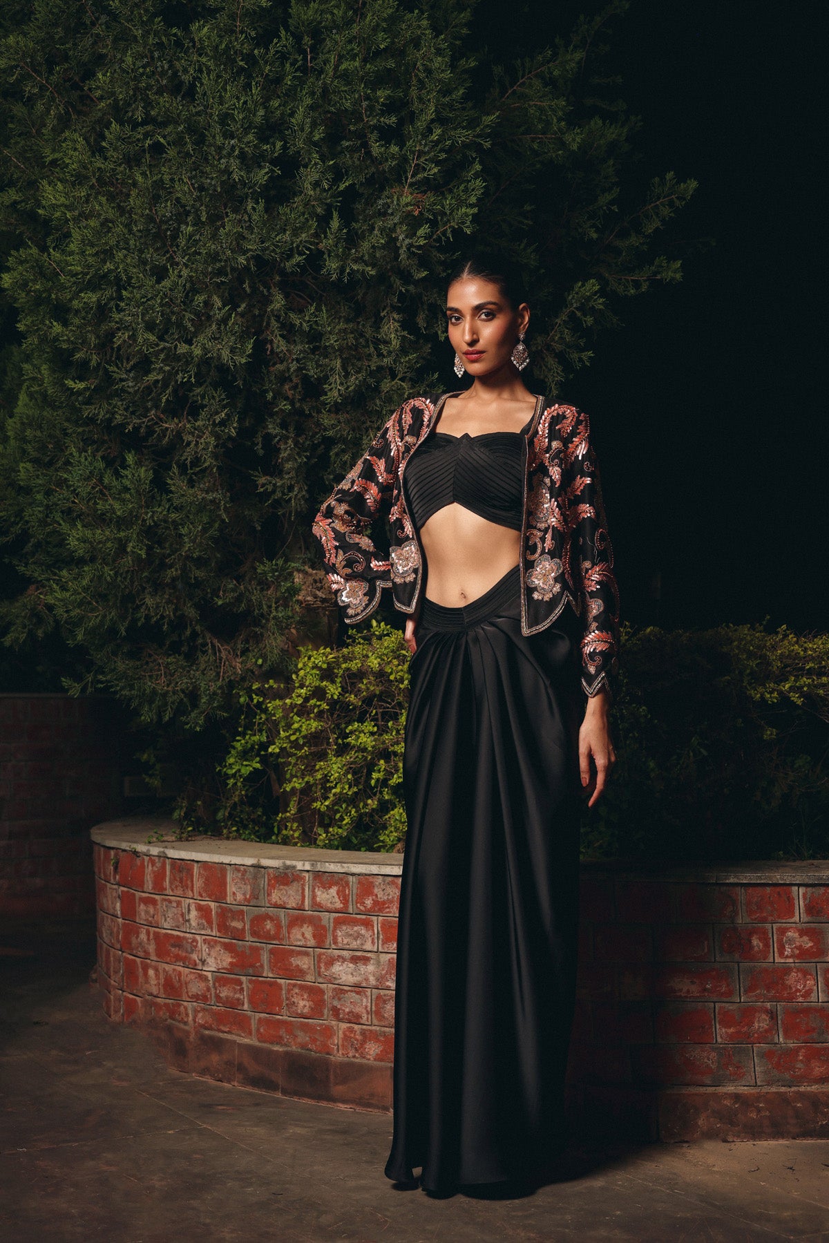 Black satin set featuring a pleated skirt with gathered waist detailing and a structured pleated blouse, paired with an embroidered cropped jacket adorned with sequin, cutdana, and crystal motifs in metallic tones. A striking, sculpted ensemble perfect for cocktail evenings, receptions, and elegant soirées.