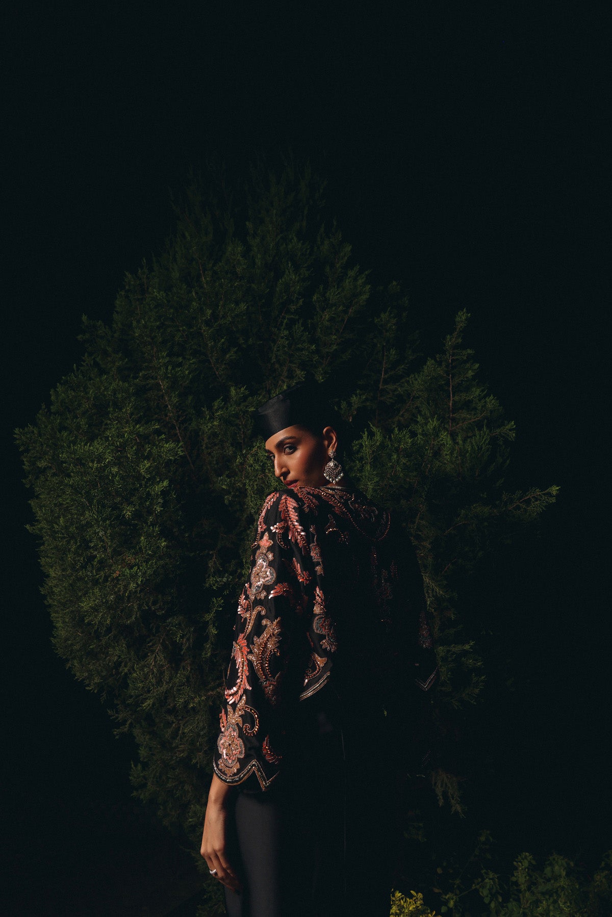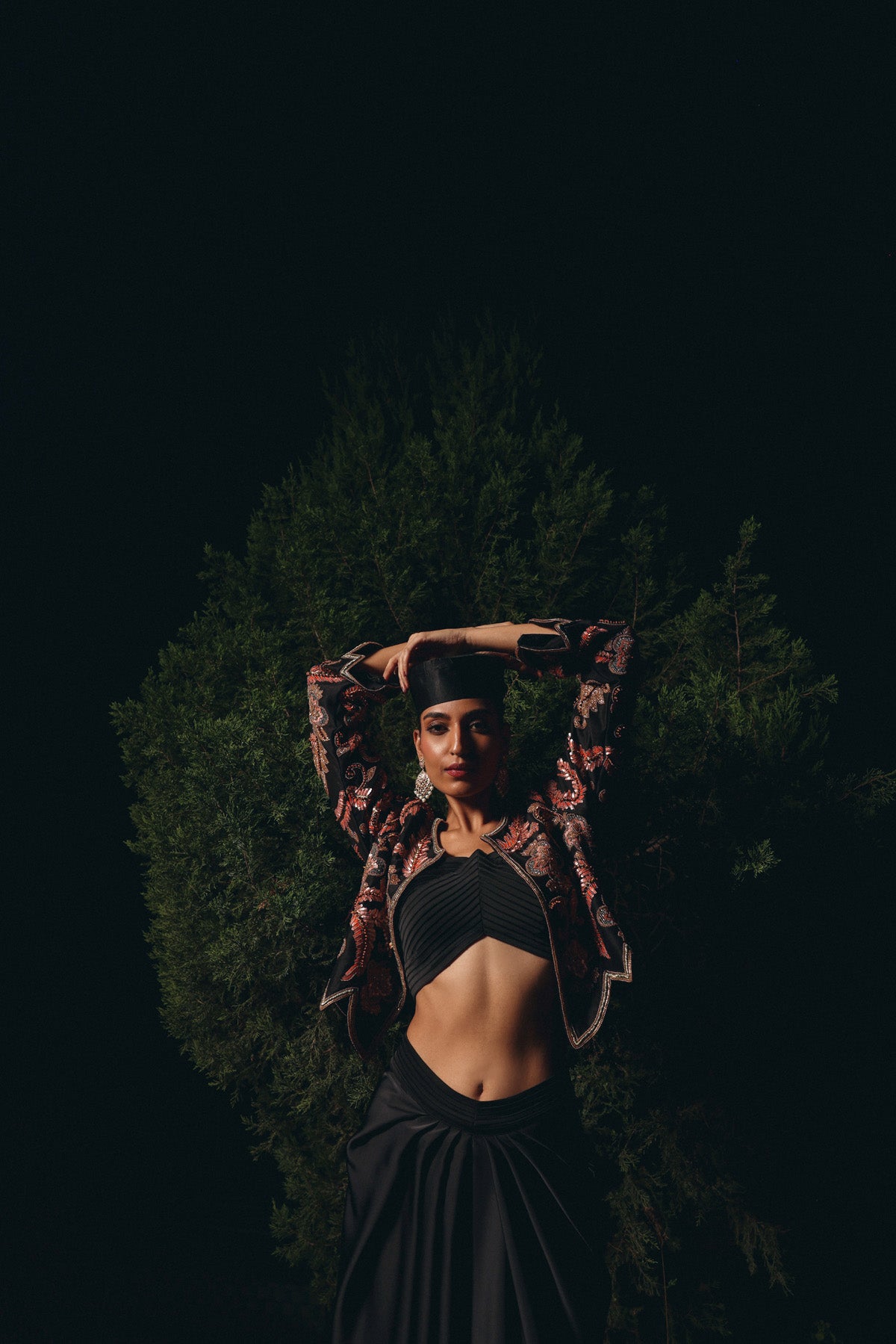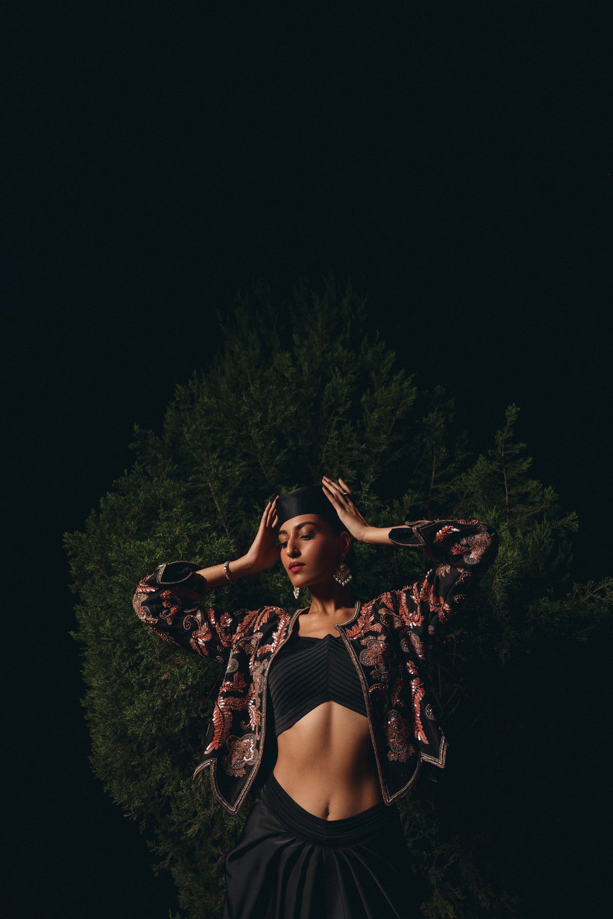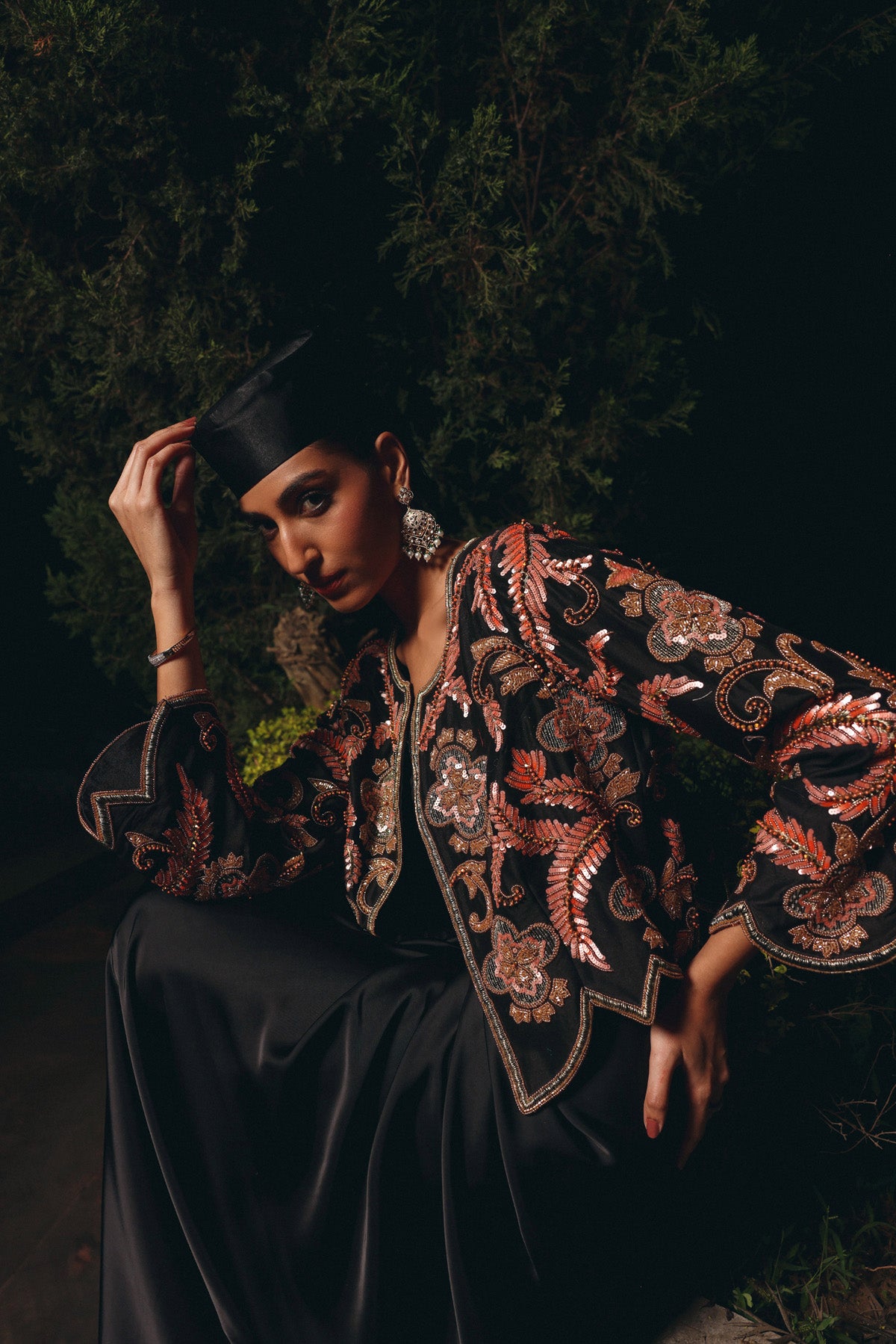 Black satin set featuring a pleated skirt with gathered waist detailing and a structured pleated blouse, paired with an embroidered cropped jacket adorned with sequin, cutdana, and crystal motifs in metallic tones. A striking, sculpted ensemble perfect for cocktail evenings, receptions, and elegant soirées.