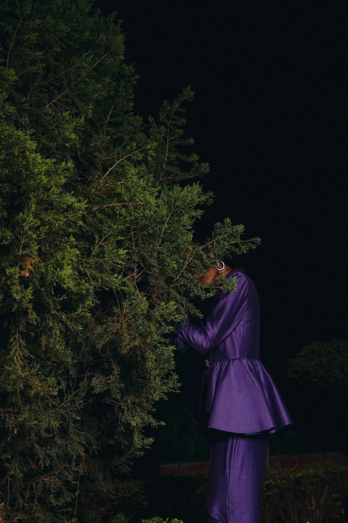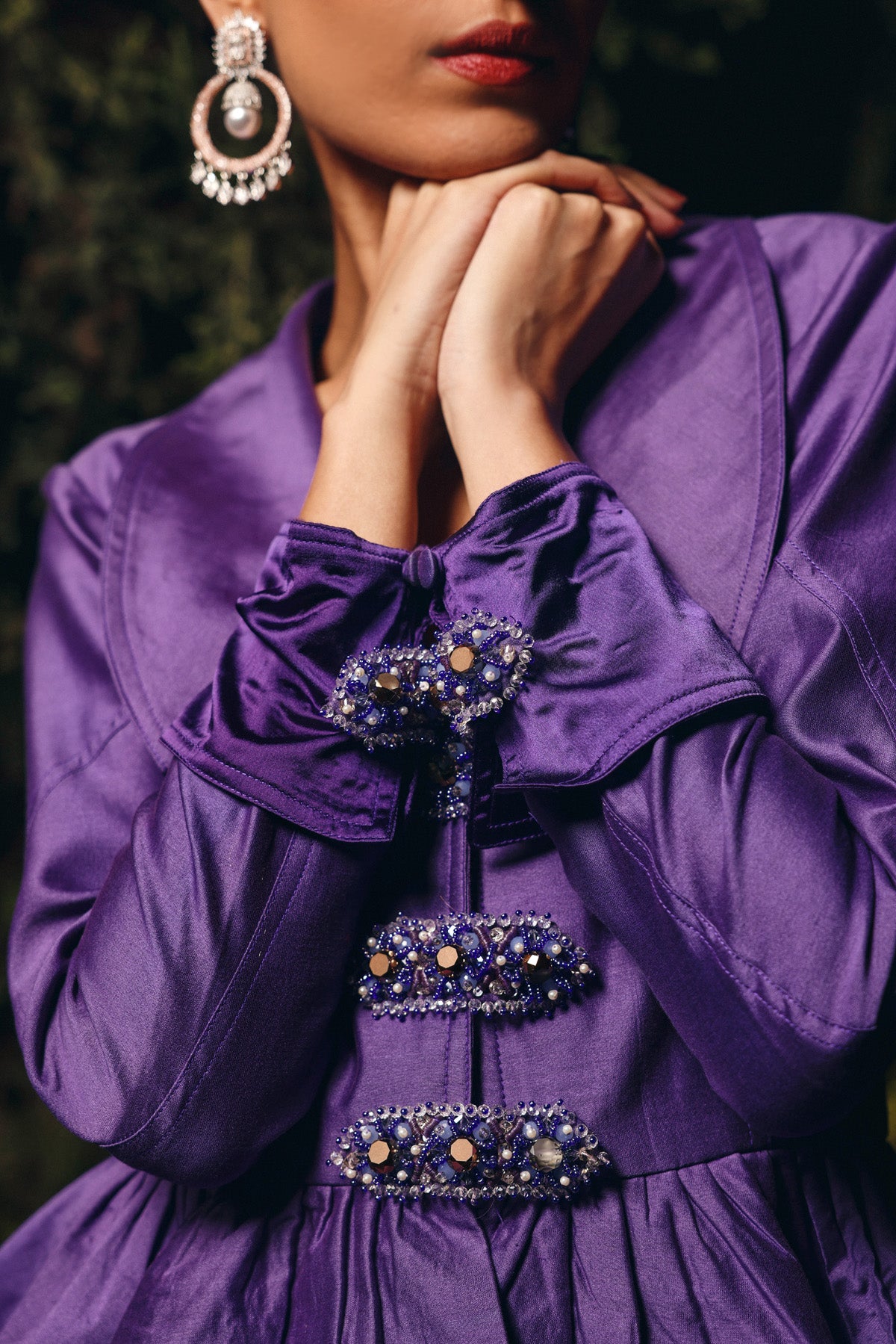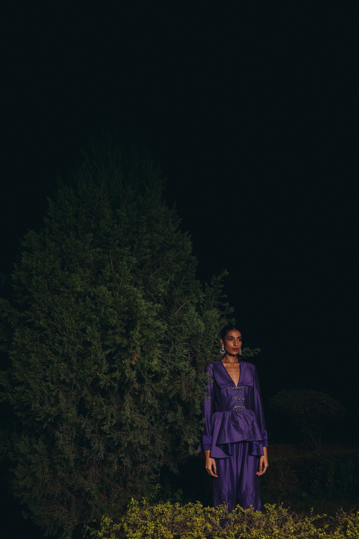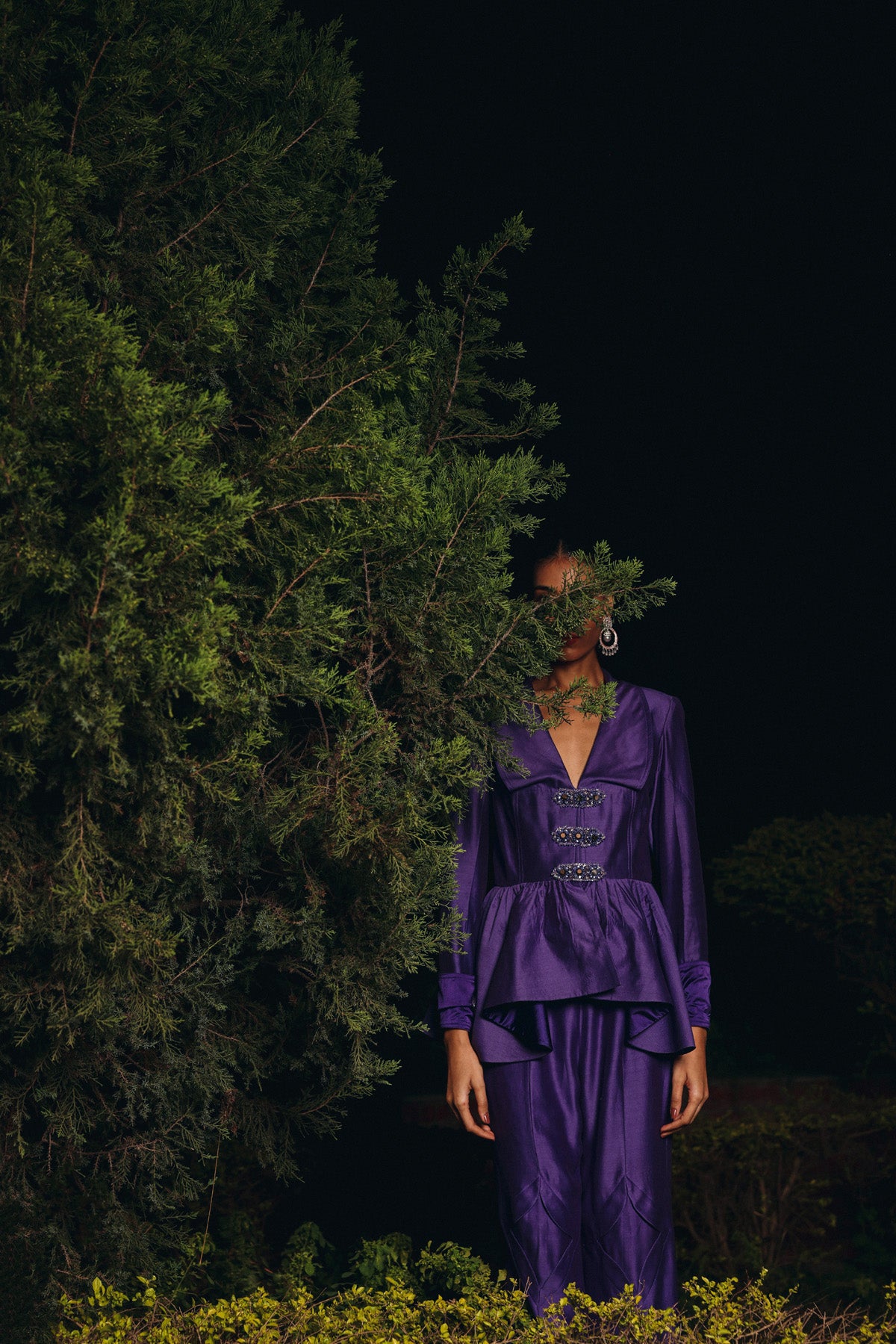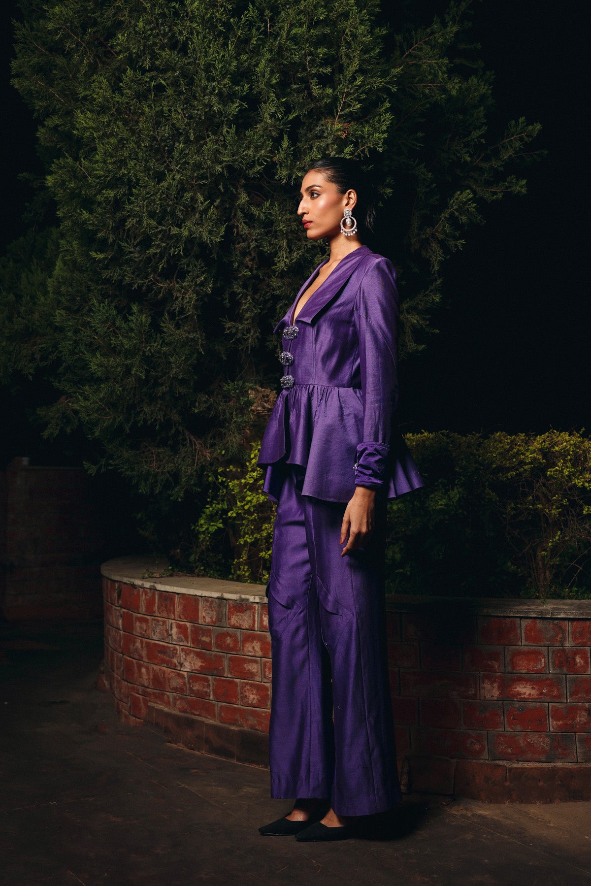 Purple silk Chanderi set featuring a tailored peplum jacket with structured shoulders and crystal-embellished clasp closures. Paired with coordinated straight-fit trousers a sharp, refined silhouette perfect for cocktail evenings and modern festive occasions.