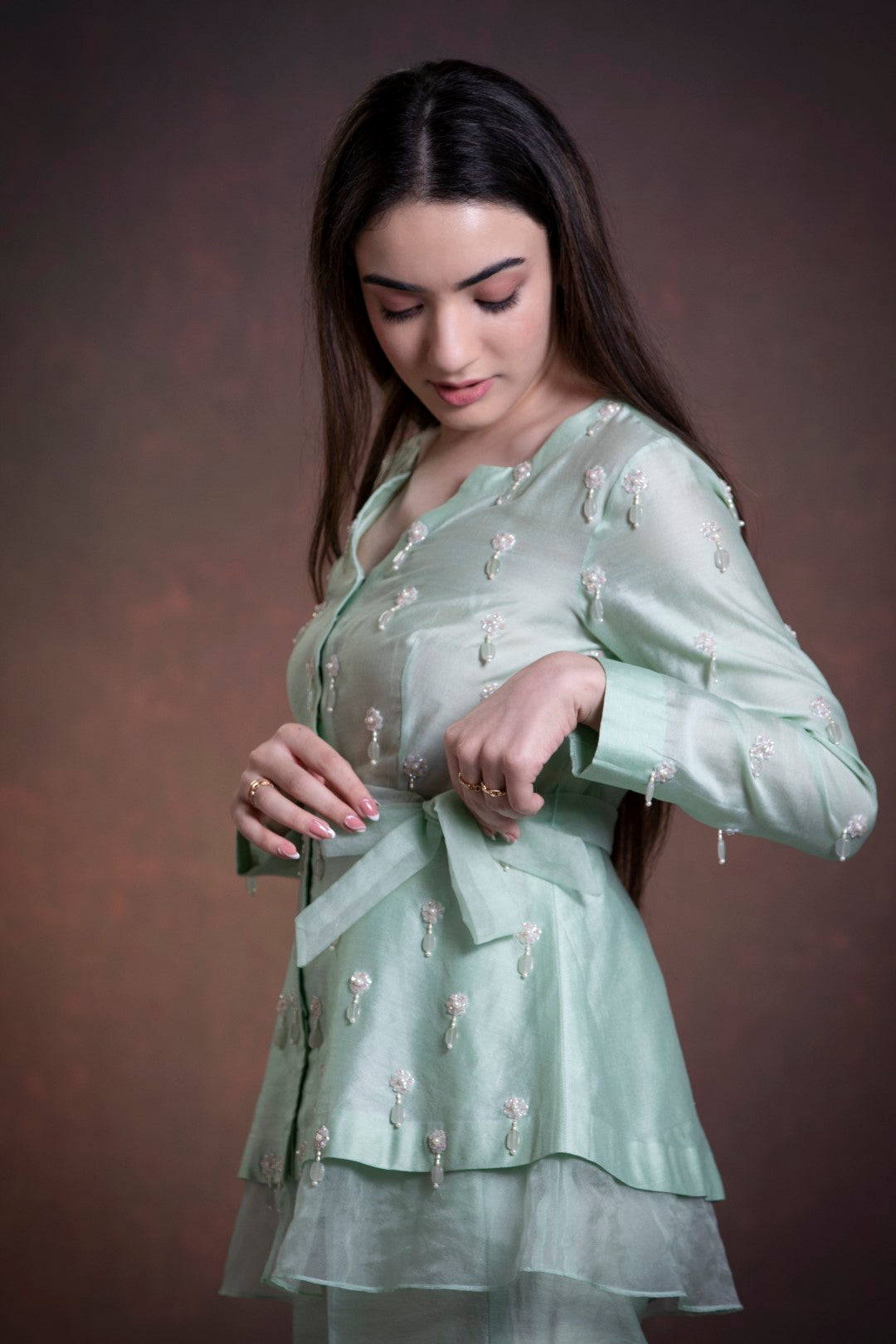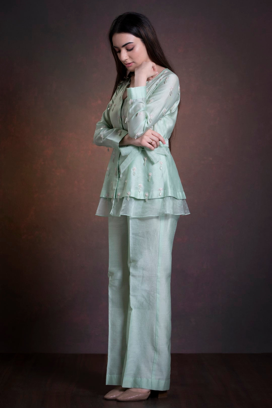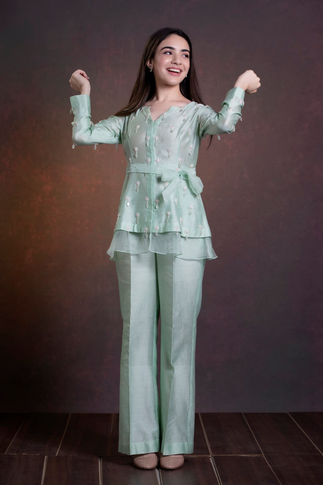 A peplum top and pants with tassel detailing all over the peplum and an organza belt- flirtatious and gracious all in one.