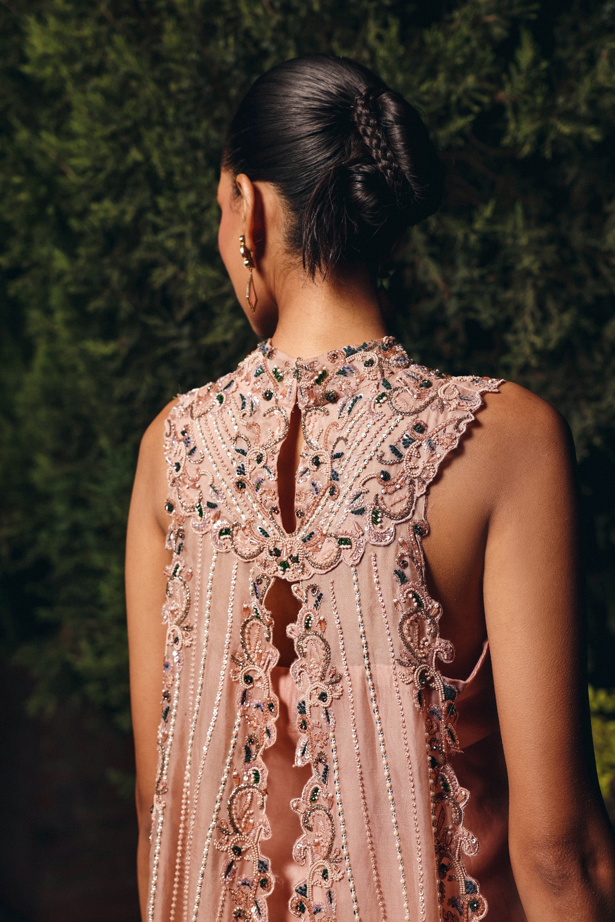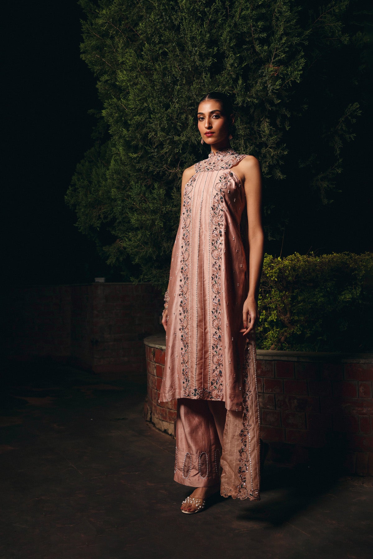 Muted Rose silk Chanderi set featuring a high-neck sleeveless kurta with vertical floral embroidery and attached dupatta panels. Paired with coordinated embroidered pants showcasing cutout detailing — a graceful, contemporary ensemble perfect for festive days and intimate celebrations.