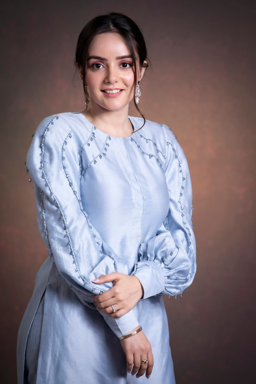 Kurta-pant set with Exaggerated Embroidered Sleeves in an Icy Blue Chanderi silk.