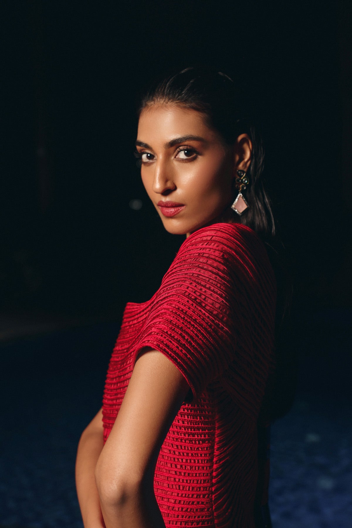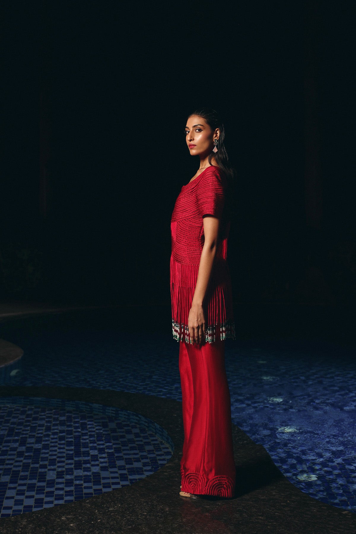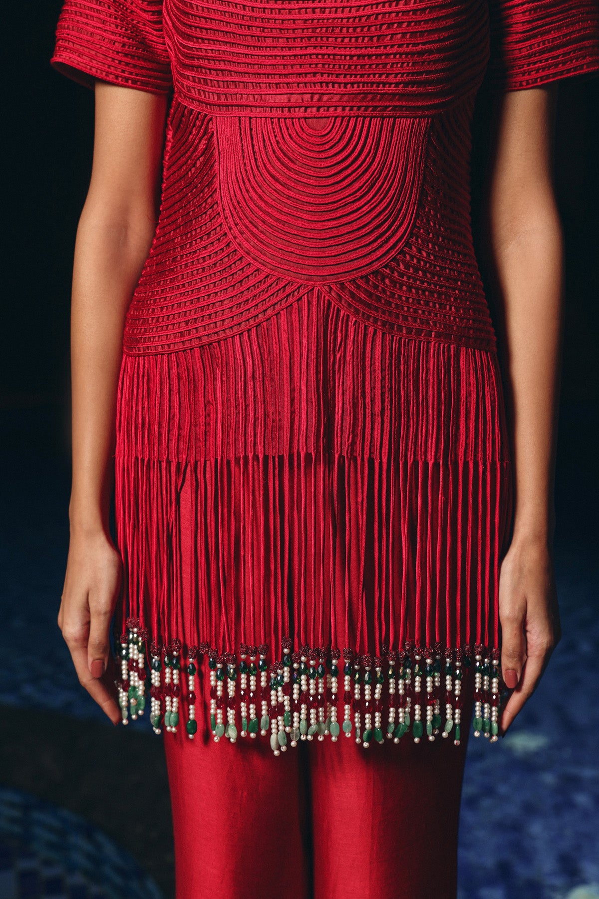 Red silk Chanderi set featuring a circular tunic with all-over dori embroidery and pearl-bead tassel detailing along the hem. Designed with a rounded square neckline and short sleeves, paired with embroidered straight-fit pants a refined silhouette ideal for festive evenings and celebration dinners.