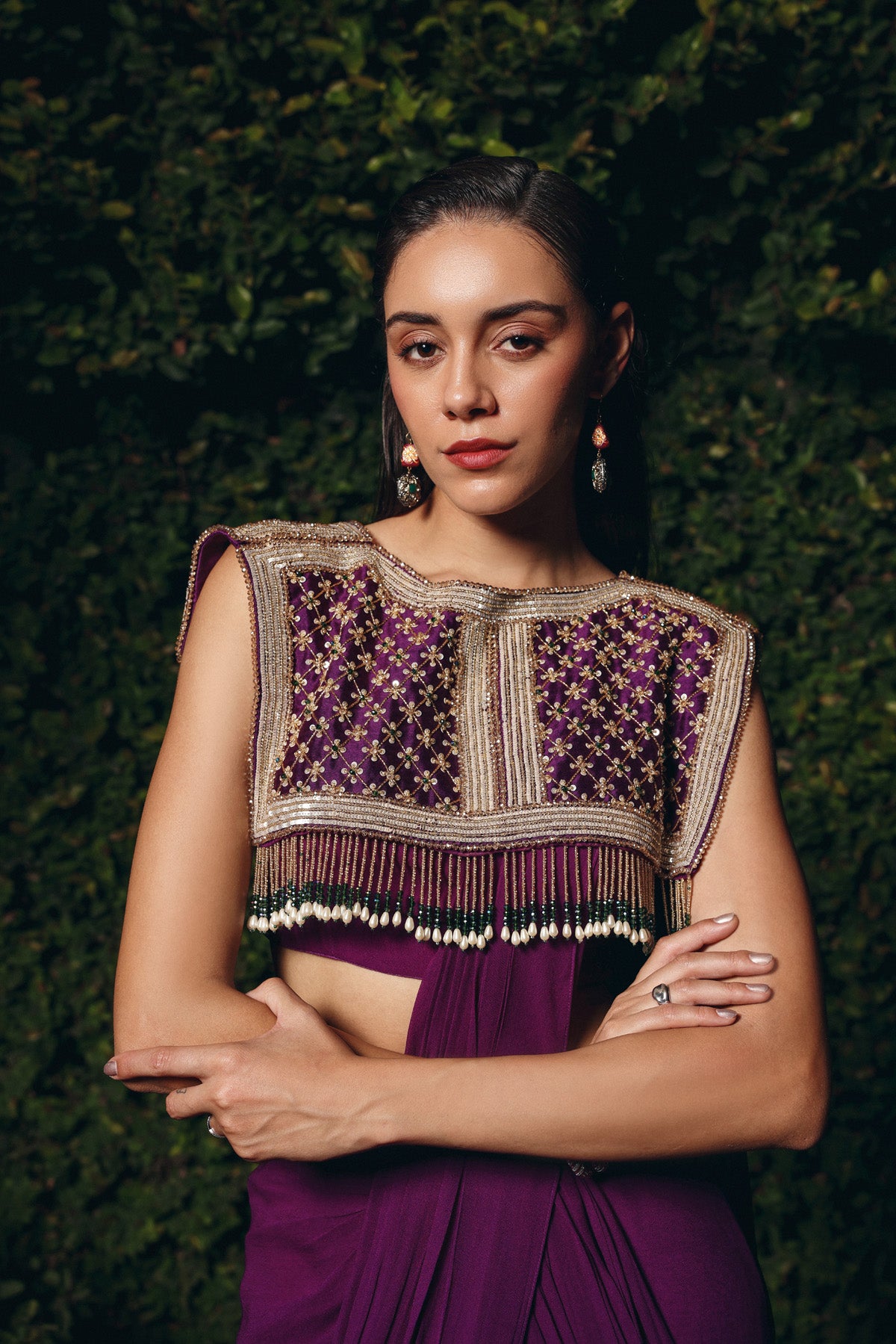 Deep Plum pure georgette pre-stitched saree featuring a ruched drape and fluid fall, paired with a sleeveless hand-embroidered blouse adorned with sequins, beads, and tassel detailing at the hem a graceful draped silhouette perfect for cocktail, reception, and festive evenings.