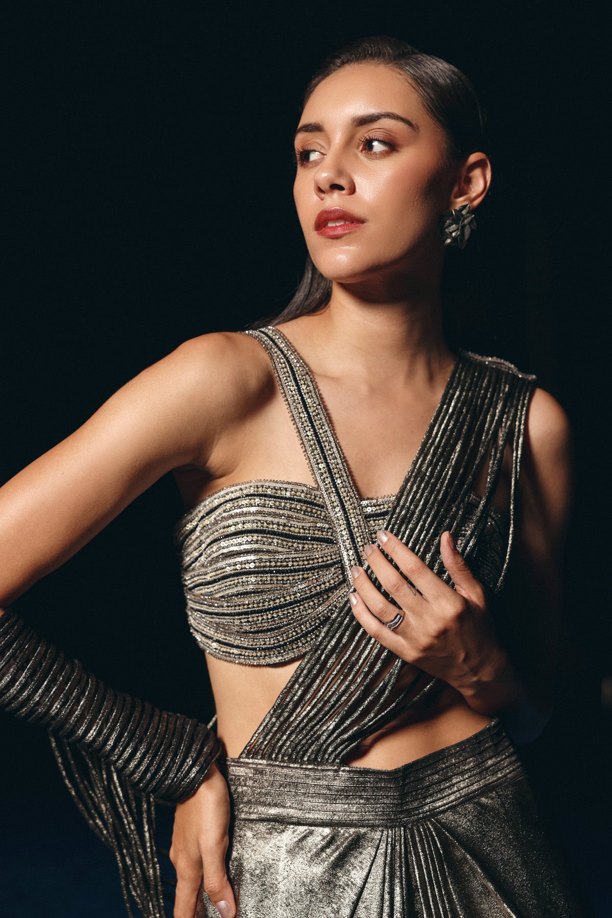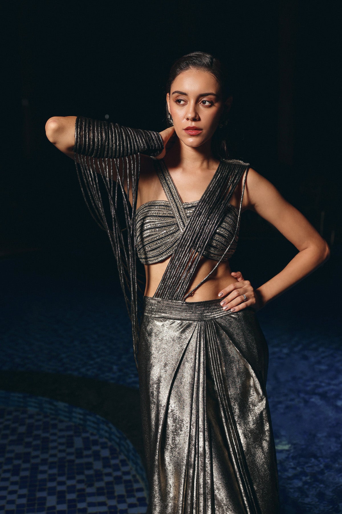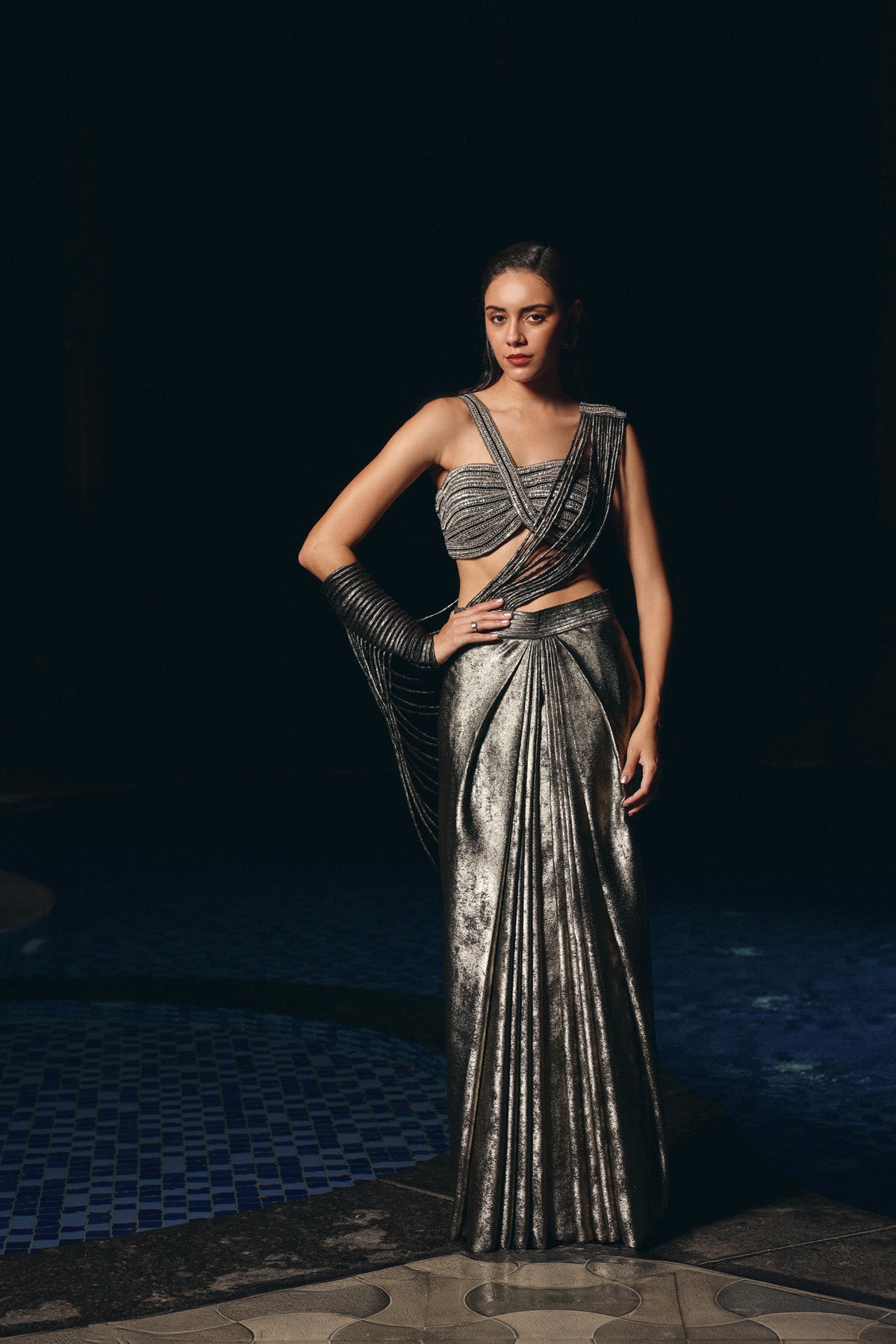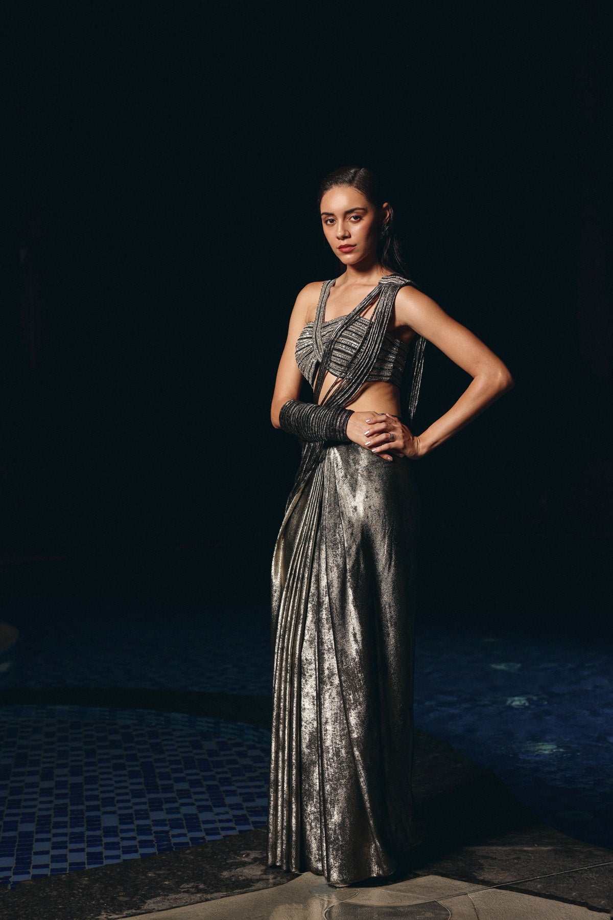 Gunmetal Silver metallic georgette pre-stitched saree featuring a sculpted drape with hand-embellished metallic doris and a contoured silhouette. Paired with a structured one-shoulder bustier adorned with draped crystals and glass beads a statement look made for cocktail soires and red-carpet evenings.