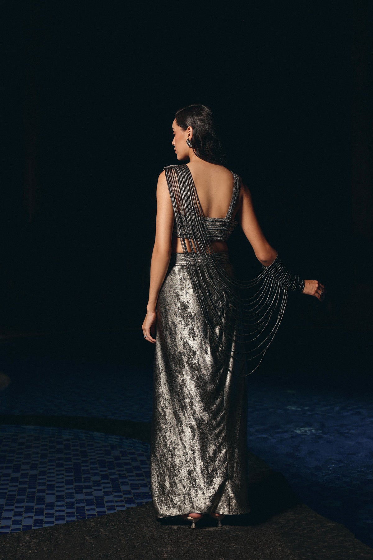 Gunmetal Silver metallic georgette pre-stitched saree featuring a sculpted drape with hand-embellished metallic doris and a contoured silhouette. Paired with a structured one-shoulder bustier adorned with draped crystals and glass beads a statement look made for cocktail soirées and red-carpet evenings.
