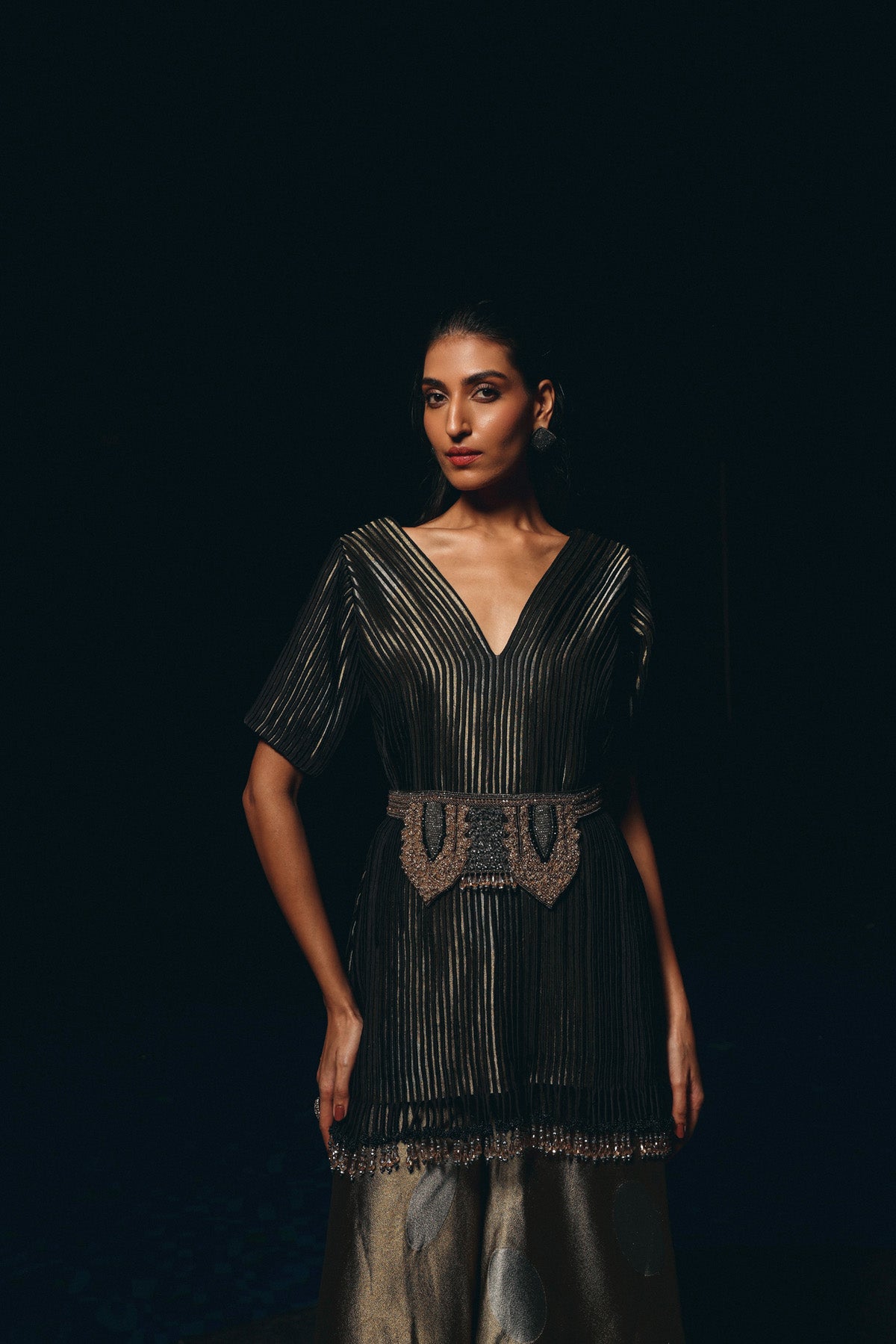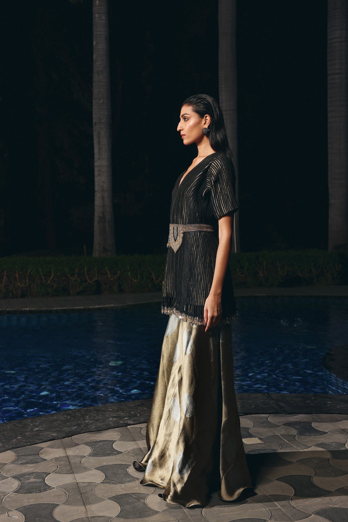 Black Gold textured metallic tissue set featuring a structured V-neck tunic with satin dori embroidery and crystal tassels along the hem. Paired with a flared sharara and a hand-embroidered crystal-beaded belt a striking ensemble crafted for cocktail evenings and reception celebrations.