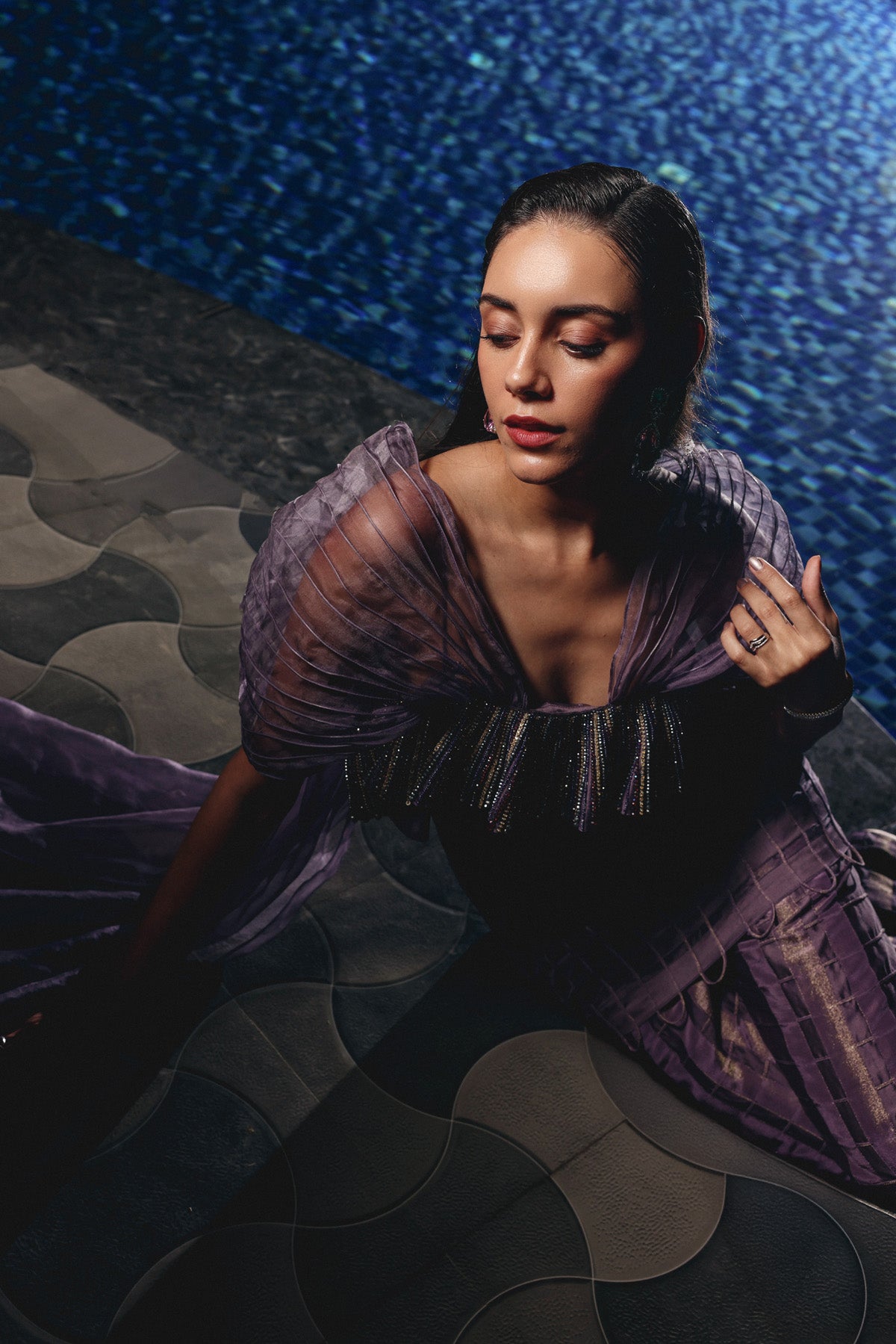 Charcoal Grey organza and silk Chanderi set featuring a structured tunic with grid-textured embroidery and crystal highlights, paired with wide-leg trousers detailed in matching gridwork and dori accents. Finished with a pleated organza shoulder drape for added fluidity a modern, statement ensemble perfect for cocktail and contemporary festive evenings.